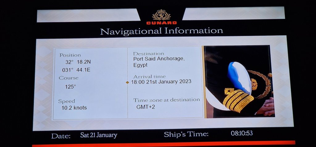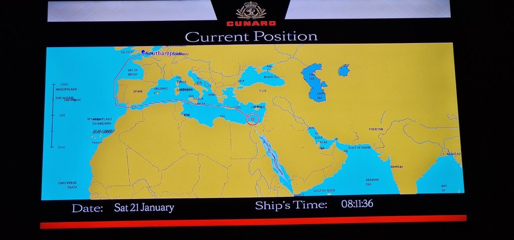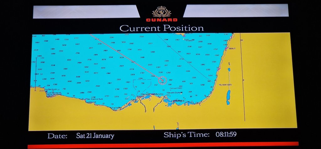 As you can see, we are ambling very gently along, heading south-east, now not so very far from Port Said, where we shall anchor until our scheduled slot to transit the Suez Canal, at 04.00 hrs. We shall exit the Suez Canal between 15 and 16.00 hrs.