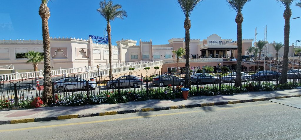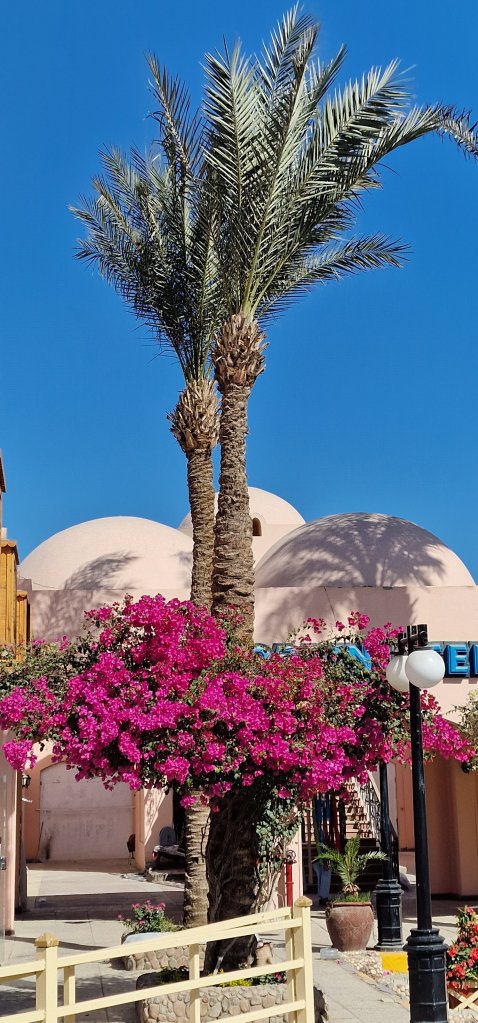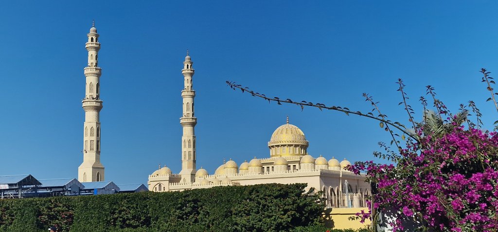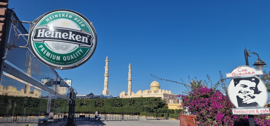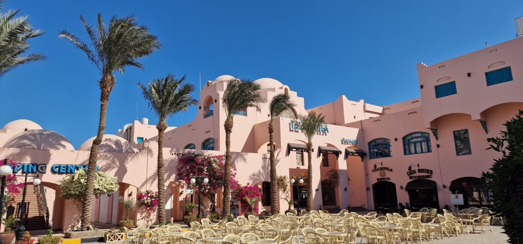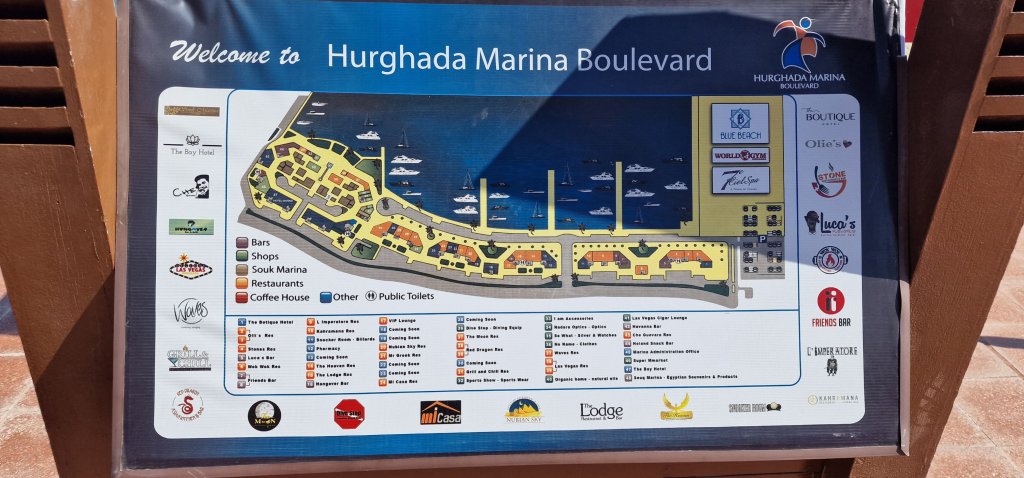 Jo decided that she might like to experience a submarine dive in the Red Sea, a much shorter and far more attractively timed shore experience. My plan was to take the Jeep ride across some desert for tea and snacks at Bedouin encampment, witnessing what would promise to be a spectacular sunset. Both options had, however, had recently sold out. “Plam B” was to turn up at the coach anyway in case anyone had cancelled at the last minute or that the coach might have had extra seating capacity. This wasn’t to be. There was one further option, a coach to the (now) resort town of Hurghada, some 33 miles from Safaga. We would be allowed three hours to do our own thing. Our tour guide suggested walking a fairly short distance along a bustling and noisy main road and then a few dusty side streets to the Marina where posh yachts were mored and a beautiful waterfront development offered a wide choice of eateries and places to relax, all with (thankfully) luxurious bathroom facilities. Jo was disappointed that a possible glass bottom boat trip had to be pre-arranged. It was lunchtime, and we decided to try out some Egyptian cuisine. What was on offer felt more Mexican as we both chose a fajita, mine with chicken and vegetables, hers with seafood – both with French fries. We had been warned to stay away from anything uncooked, including fresh fruit, salad, and anything prepared with untreated (tap) water.