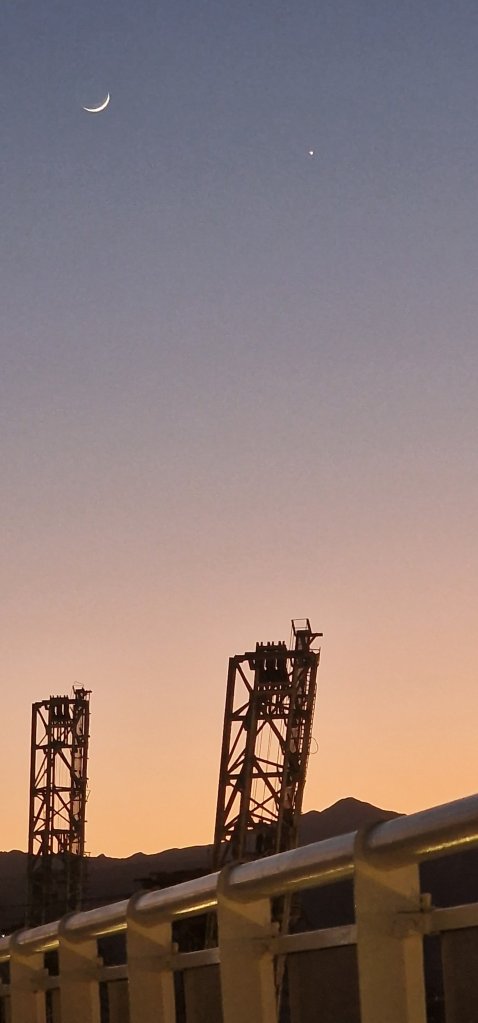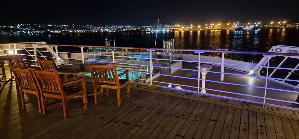To accommodate those lucky enough to visit the Valley of the Kings, etc, we were not due to sail away until 21.30 hrs. In fact, we got underway 45 minutes later. Jo and I had a hot drink in the Carinthia Lounge after boarding the ship somewhere around 4 pm. A quiz was taking place, at the end of which, we were recommended to view the sunset. Distant hills and nearby dockside machinery obliterated what might have been something quite spectacular as in previous evenings.