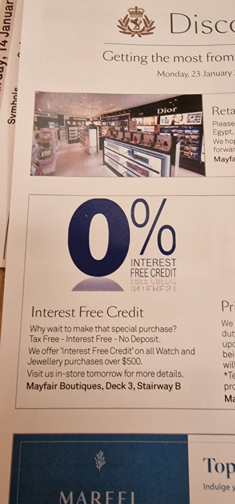 I could buy this item and make 12 easily affordable monthly payments without impacting my holiday budget. Firstly, the sales staff were not familiar with what Cunard was trumpeting. Somebody had to be called to help out! The credit company was contacted, and after much hoo-hah, my application was not successful. I chose to be quietly disgusted and offended, tongue firmly in cheek. Further on board spend by way of compensation for the embarrassment?! We’ll see. I bought the watch anyway and was thankful to find on line that brand new models were significantly more expensive on shore. This current voyage provides the ideal opportunity to see if this time-piece really does what I am given to understand that it does, i. e. adjust automatically time and day, wherever one is in the world, be it on land, or way out at sea. The manual, albeit in simple form, seems to contradict the selling points of this time-piece.