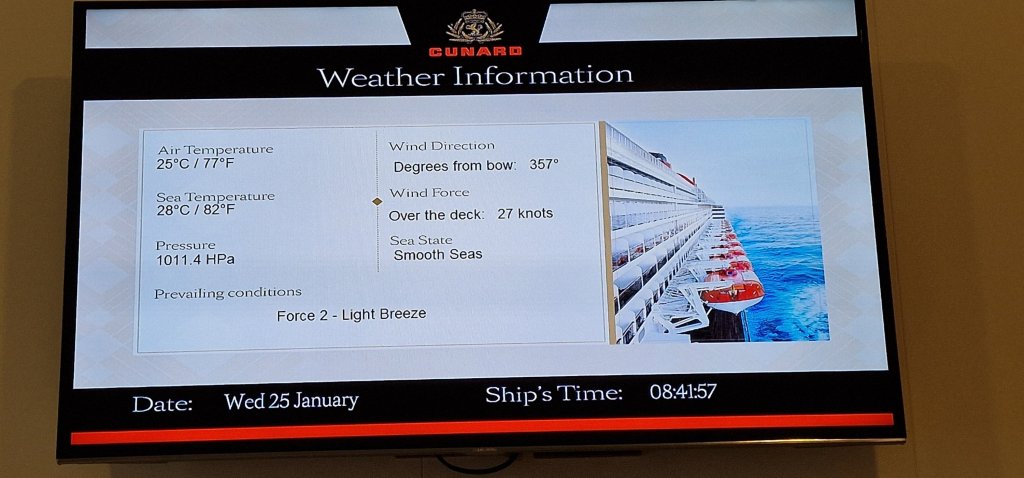 Already, this is Day 14. Strangely, right at the start, I was not alone in feeling I had been on QM2 “forever,” and unusually for me, I found the thought of the itinerary ahead of me, somewhat daunting. Usually, I am not “fazed” by the thought of being away from home for months on end. Thankfully, those misgivings have all but evaporated like the morning dew, and the days seem now to fly by.
