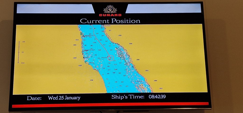 It is cloudy this morning, but warm dry, and still calm out there. We are or soon will be in dangerous waters with the threat of piracy. I’m not joking. For three nights between dusk and dawn, Decks 6 (aft) and all of Deck 7 will be out of bounds as armed personnel guard the ship from (highly unlikely) invasion. During the day, all is reasonably normal. 11.00 hrs BST + 3