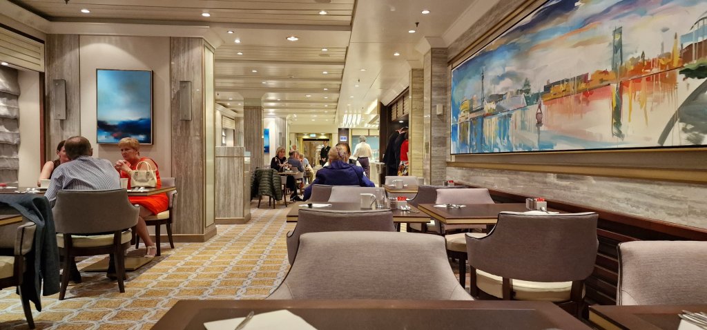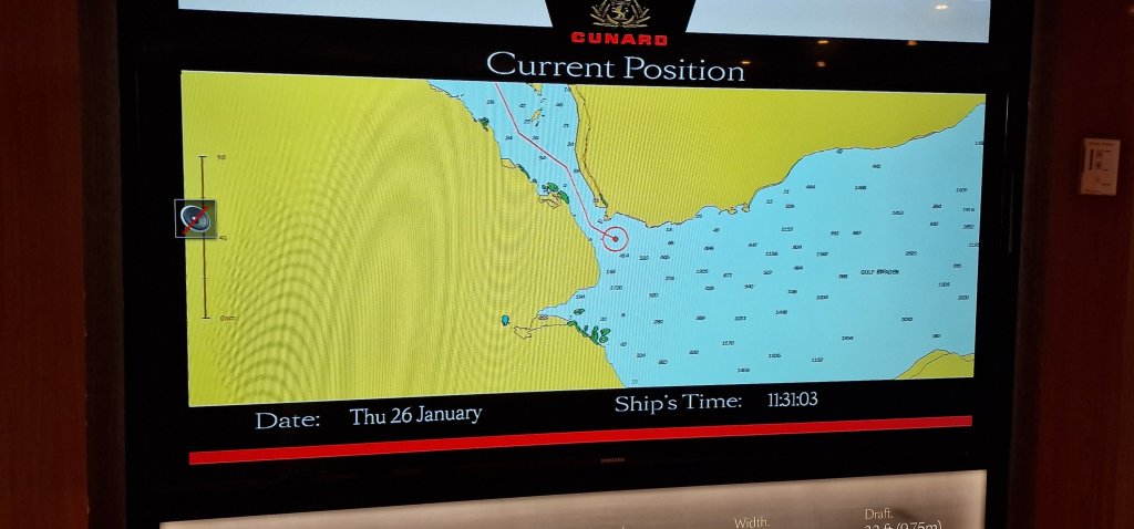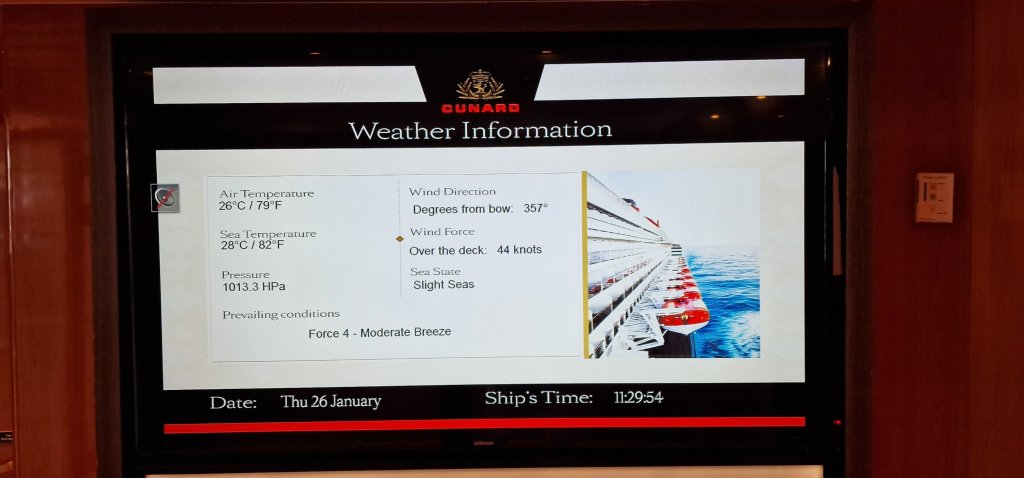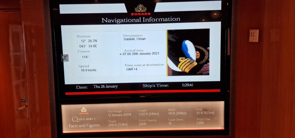 QM2 must be showing its age. Indeed, it has just entered its 20th year of service (12/1/23), and I, perhaps along with quite a few others, regard the ship as a second home. However, an announcement over the ship’s P.A. system seemed to announce that because some technical malfunction, none of the ship’s toilets could flush. I was thus thankful I was a passenger and not a cabin steward! (13.43, Kings Court Buffet) Now to continue walking.
