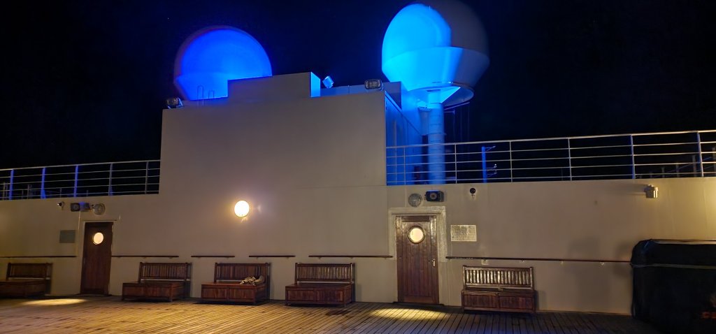 Around 23.55 hrs. I caught up with Jo later in the afternoon. She wanted to see a movie which, although seen before, she thoroughly enjoyed for (at least) a second time. Thus, I dined alone but wasn’t alone for long before being joined by a couple who had sat an adjacent table for dinner a couple of nights ago. Another couple made a fivesome. Jo then caught up with me at the show. Having slept for England last night, I am wide awake right now (after midnight). I took some warm fresh air on Deck 13 with very little lighting due to the pirate precautions. The stars shone like brand new lights. A patrolling ship’s officer lent me his night vision lens through which I could discern a night sky of nothing but stars. What a privilege!