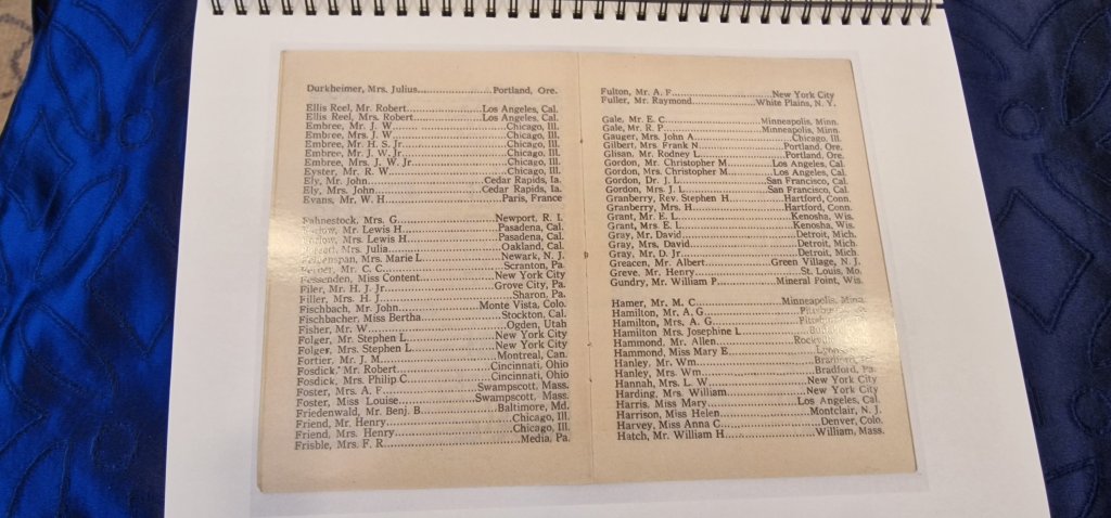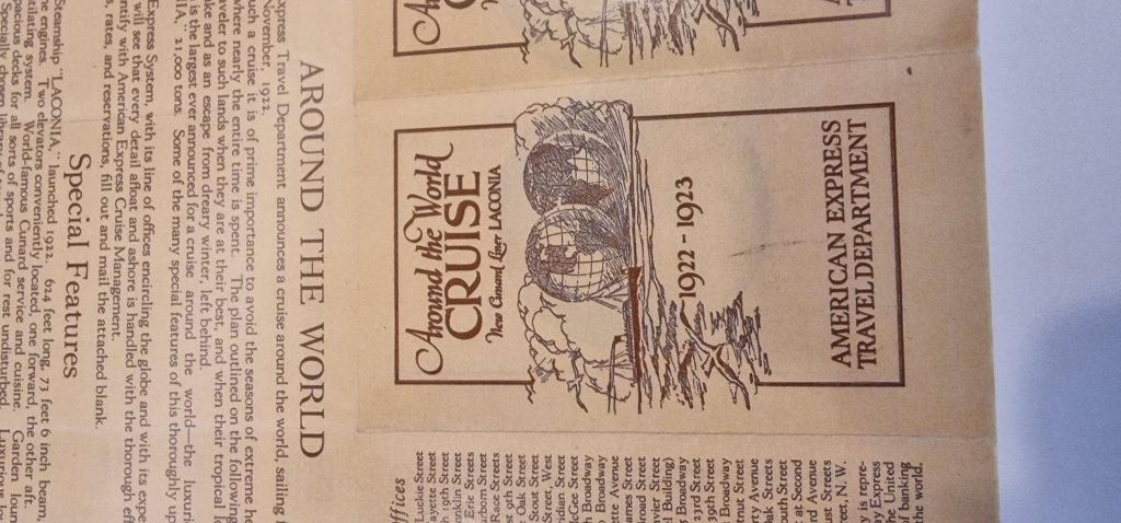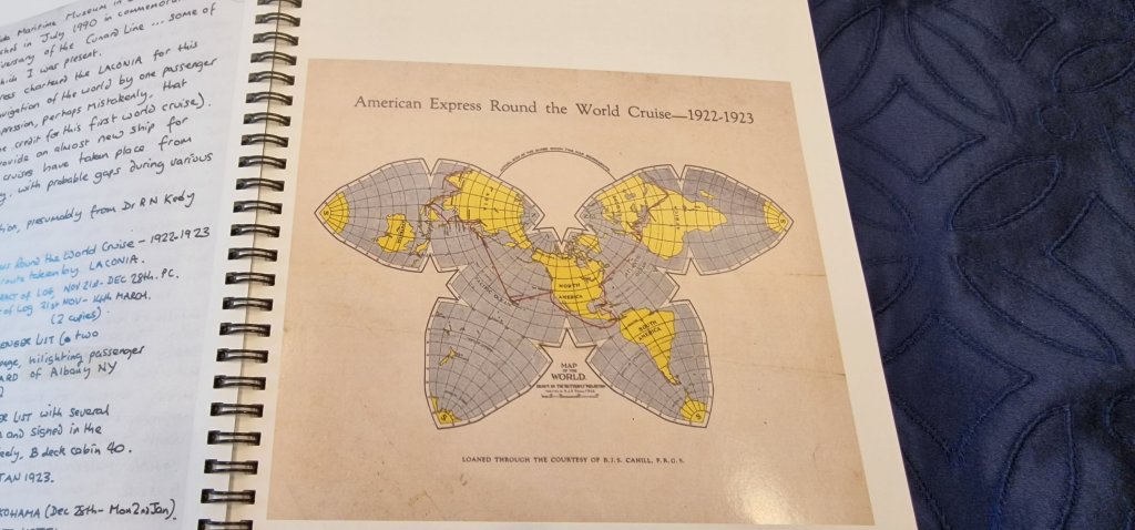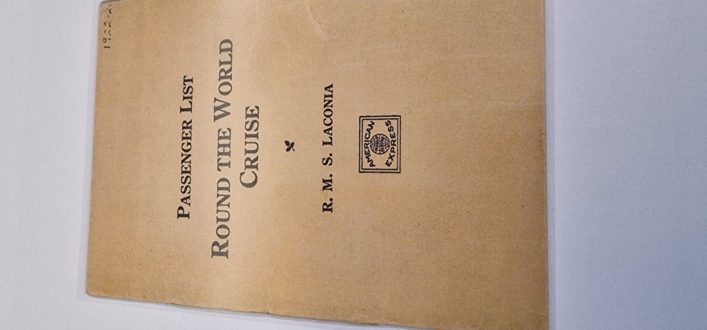 This morning, I handed in a portfolio of items from my collection of ephemera from the 1922 World Cruise, the Centenary of which today’s World Voyage is commemorating. Some items are illustrated below.