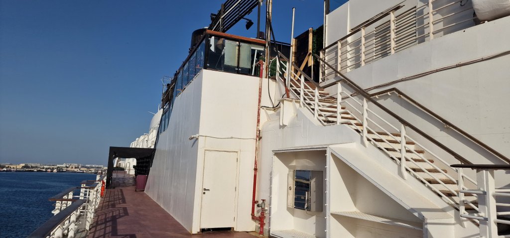 I think I saw all I really wanted to. It’s very strange remembering QE2 as the Flagship of the Merchant Navy and its regular transatlantic schedule. Its final voyage was to Dubai in November 2008, but it wasn’t until April 2018 that the public was able to go aboard. Five years on, and I remain unsure of its viability. Much has been invested in making QE2 competitive and attractive, but the outside still feels a bit worse for wear. The teak decks really are messed up, and the Boat Deck remains bereft of its tenders and life boats. At one time, these could be seen nearby in an open space of fenced off land. Fortunately, I did get to photograph these on an earlier visit.