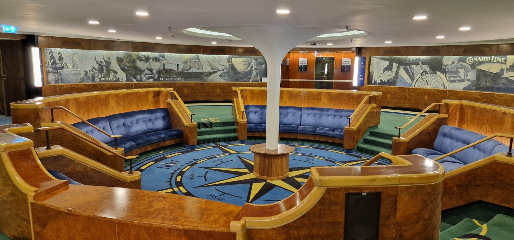 R.M.S. Queen Elizabeth 2 is rather different from its sea going days. The Caronia Restaurant appears to be the Business Centre. Whether I shall get to see “all over,” I’m not sure. I am in what was The Lido in QE2 days, and generally, the layout is recognisable. Needless to say, I chose to have lunch on board and relax at a window seat, just as I would on a long ago transatlantic crossing. Sadly, the ship feels all but deserted, but maybe 2.15 is a bit late for lunch. The two courses I chose were both piping hot, the main course appearing to be freshly made.