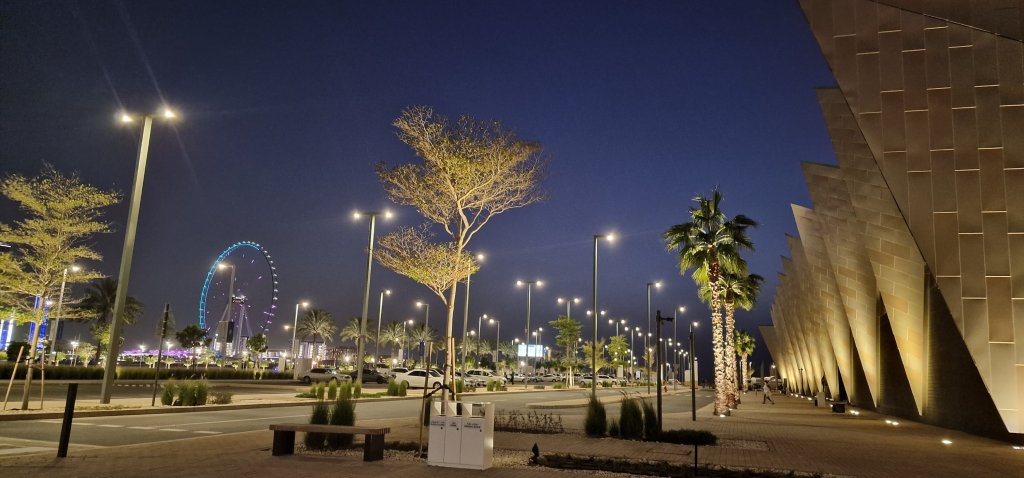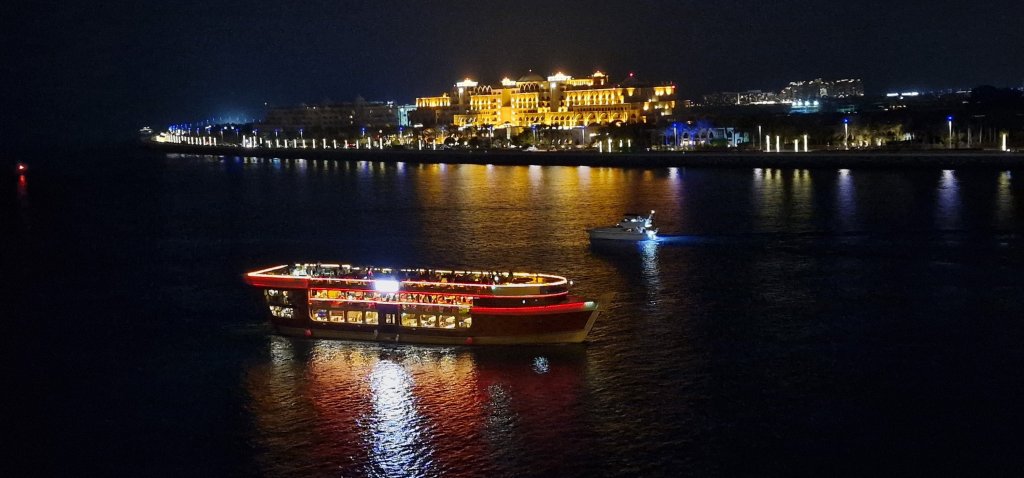 After spending over four hours enjoying lunch and looking around both the ship and the exhibition/museum in the reception area, I took a taxi back to Queen Mary 2. I met up with Jo, who opted for an early dinner. I was far from hungry and just had two glasses of water. I returned to my cabin after around 15 minutes. I watched part of a movie but then went up to deck 7 to hopefully finish this blog. The new Cruise Terminal in Dubai is in a much nicer setting than at Port Rashid, even if the latter is close to the QE2. Party boats sailed by throughout the evening with city backdrop quite spectacular.