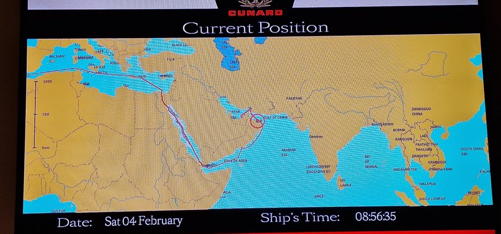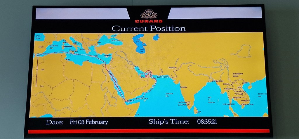 For just the third time on this voyage, I failed to reach my ideal target of 11,000 steps. For some reason, I felt bereft of energy all day. Presumably, this was due to being woken up just after 6.30 this morning after a late night waiting for Queen Mary 2 to depart from Dubai.