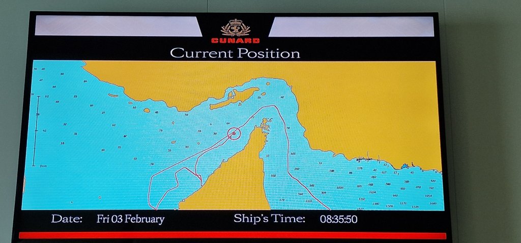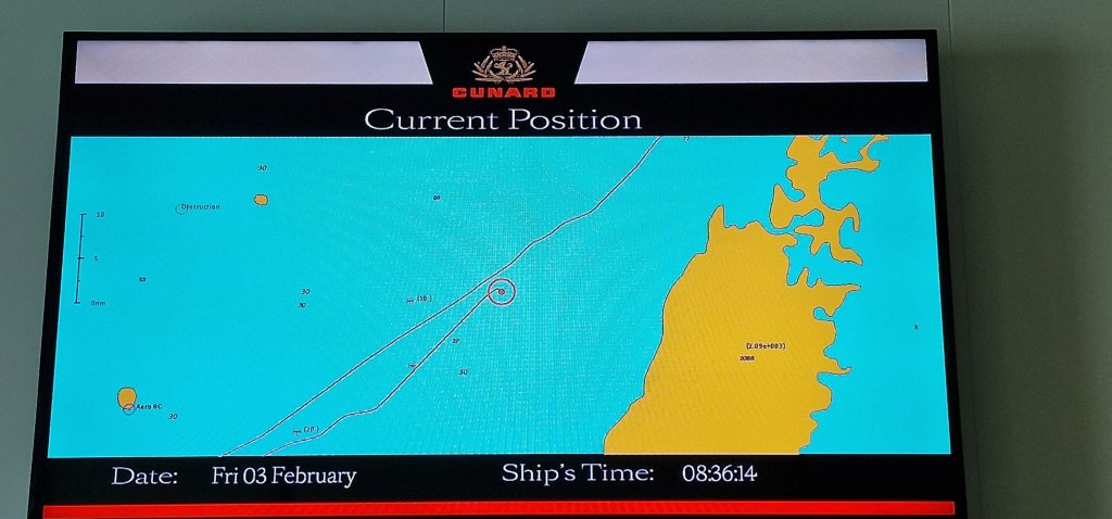 Now, I know the inadequacy of the soundproofing in those lovely single cabins on Deck 2. I must be careful not to talk to myself like I do back home, especially with the industrial expletives few people hear me come out with! I don’t mean to exaggerate, but I think it was shortly after 06.30 hrs that I was aroused from a much needed deep sleep to lively conversation seemingly from next door. The light through the tightly shut curtains indicated I may have overslept. With weary heavy eyes, I looked at my watch. To my abject disgust, it was reading around 25 minutes to 7 o’clock. That is 02.35 hrs back home, 21.35hrs in New York! (I think). I hope this wake-up call is a one-off, but I, in turn, must be ultra careful with the TV, which I must keep extremely low. It was explained to me that the cabins are partitioned by a metal sound-conducting bulk head, not the wisest place to affix the nice flat screen Samsung television!