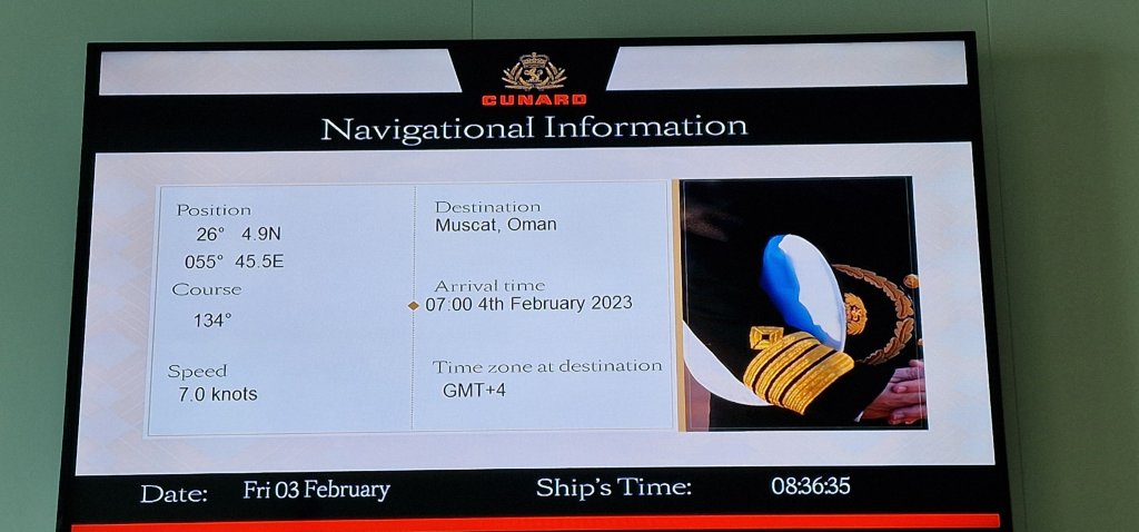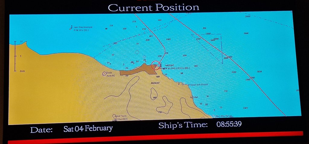 I tried to stay up to watch as we left Dubai. By the time I went to bed at 00.30 hrs this morning, we were still tied up indicating a later departure than originally planned. According to Captain Hall’s maiden noonday address, we left Dubai Cruise Harbour (much nicer than that at Port Rashid despite its proximity to QE2), sometime after 02 00hrs owing to delayed official administration procedures.