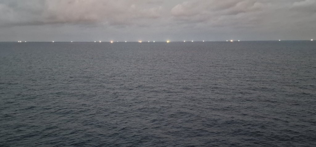 I tried hard to hit 500,000 steps before the end of last night, but that final less than a mile was too much late in the evening. It was Gala Night, and yet again, I had to don formal attire. In lieu of show night in the Royal Court Theatre, where the lady who deafened me a few days ago was belting out James Bond melodies, my tinnitus didn’t need further assistance from her! Jo assures me that the tinnitus has every chance of disappearing. Hers did. As we steamed south along the Cambodian shore line, numerous vessels could be seen, only evidenced at that time of night by their bright Illuminations.