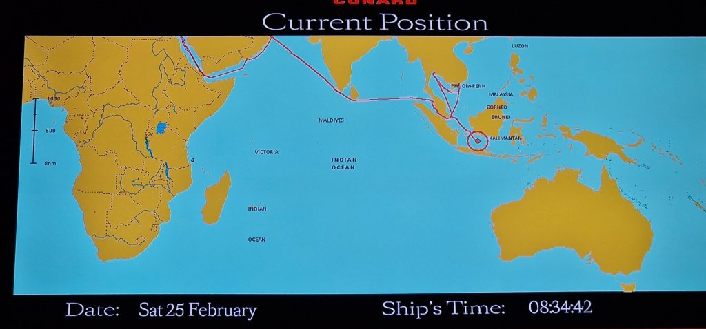 Don’t be fooled by the grey skies reminiscent of a miserable summer; it’s very warm out there. And the sun does come out frequently. Today is the second of two sea days between Singapore and Bali, and I think, probably the warmest part of this World Voyage. And for once, I felt energised to leg it around the Promenade Deck, keeping up with most other walkers, and actually overtaking a few! Up in the Atlantic Room, talk of the Singapore World Voyage Event seems to have subsided. In all honesty, it didn’t go too well, but it did finish on an inebriated high with doctors, lawyers, chief executives, BBC personnel, captains of industry and perhaps a train driver, leaping about to popular disco music as if full of the joys of youth all over again. All this, in the hallowed grounds of Singapore’s Gardens By the Bay. You couldn’t make it up, and I’m glad that I stayed to the end! I now find that those who had checked in at the earliest times were actually at the venue by 6 pm, and I’m told that Singapore Slings were offered at the entrance!