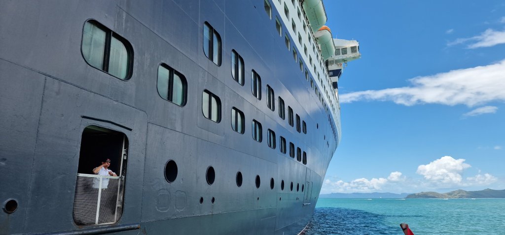 My instructions were/are to allow 45 to 60 minutes to meet at the pier head, with the warning that the coaches would not wait for latecomers. Actually, I agree, despite my propensity to leave things to the last minute. So, with 75 minutes in hand, I made my way to the gangway, only to find nobody seemed to know when the next tender would show up. It’s a 30-minute transfer to the mainland. The tender was, in fact, ready for loading after around ten minutes. The top (open) deck was available, and I had it to myself for the half-hour transfer to the small port town of Airlie Beach.