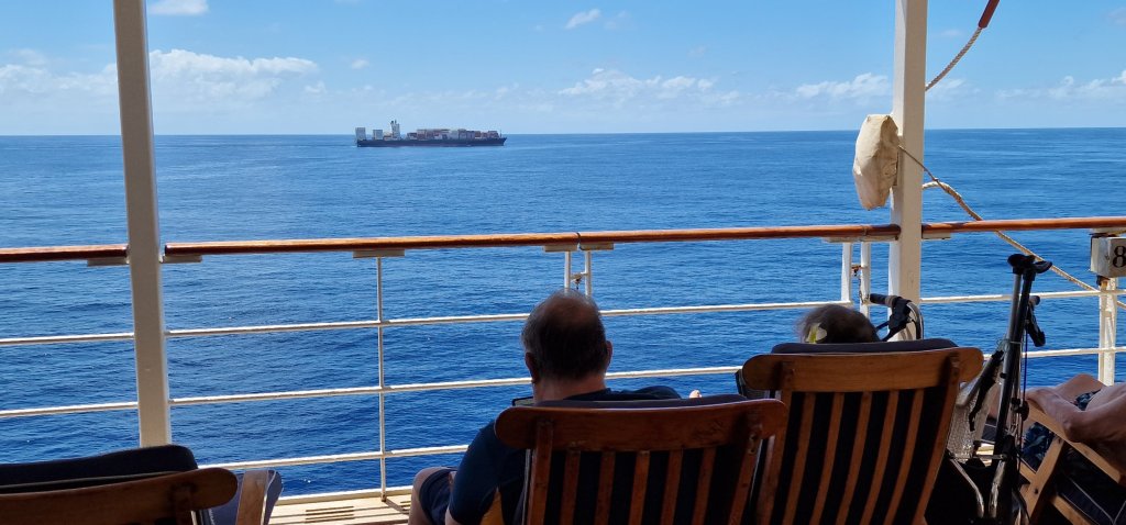It is still very warm, but a cool breeze from the South makes one side of the ship the place to escape the heat, that is, if one wants to. The deckwalkers are out in force (11.48 hrs). The sea is wonderfully calm, and apparently, we dock at a brand new cruise terminal in Brisbane at 7 am. tomorrow. My intention is to try to locate the railway museum at Ipswich, which I have heard quite a lot about in the past. Failing that, a small river trip might be a good option if available.