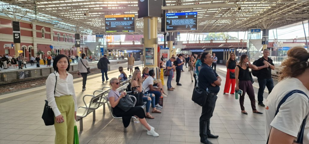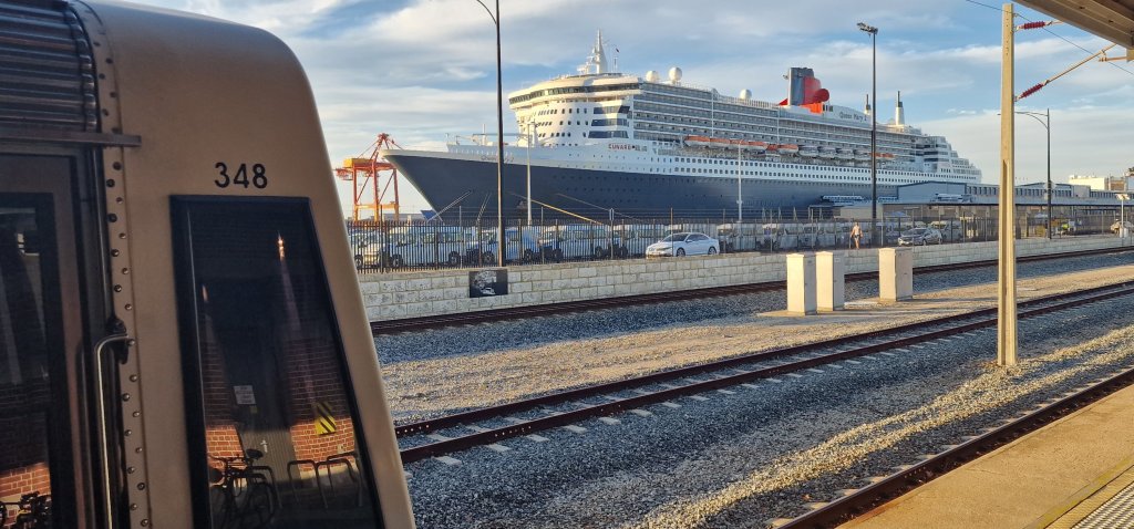 After the boat trip and late lunch, I retraced my steps back to the hotel along the walkway and cycle track. The weather was reassuringly warm with a welcome gentle breeze. But I was aware that this was my last day down-under. I picked up my one suitcase from the concierge at the Duxton Hotel, who advised me on the best way to get to Perth railway station. A train, all stations to Fremantle was due in four minutes on platform 7. I savoured every station stop as we sped with great efficiency to the final station from which Queen Mary 2 would be clearly seen.