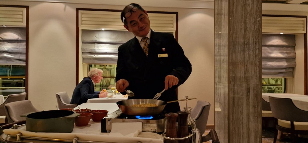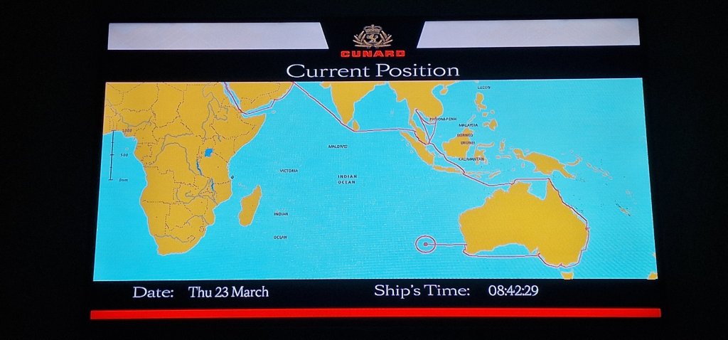 I feel a tad disappointed at the moment. Jo and I decided to forego the Gala Night yesterday and have our evening meal casually in the Kings Court Buffet. Travel-lag had caught up with me, and I didn’t really feel like dressing up for less than two hours. When I returned to my stateroom, on the bed was a fancy card, proclaiming that the formal dinner was special, commemorating the anniversary of the end of Laconia’s historic first World Cruise in March 1923. Jo rang me to express her annoyance, too. There was no build-up to this special dinner, not even in the Daily Programme, save for some special dance demonstration in the Queens Room. One less menu for the collection then! Strangely, I have just met two people who were at that dinner who told me there was nothing different, and they had not received any notification!