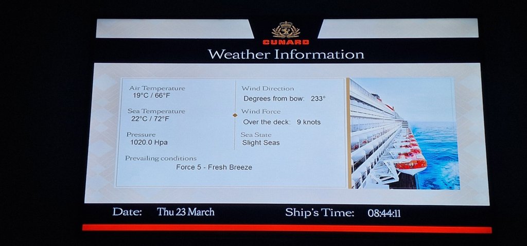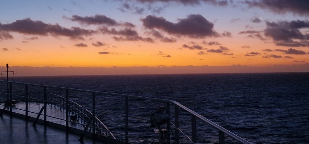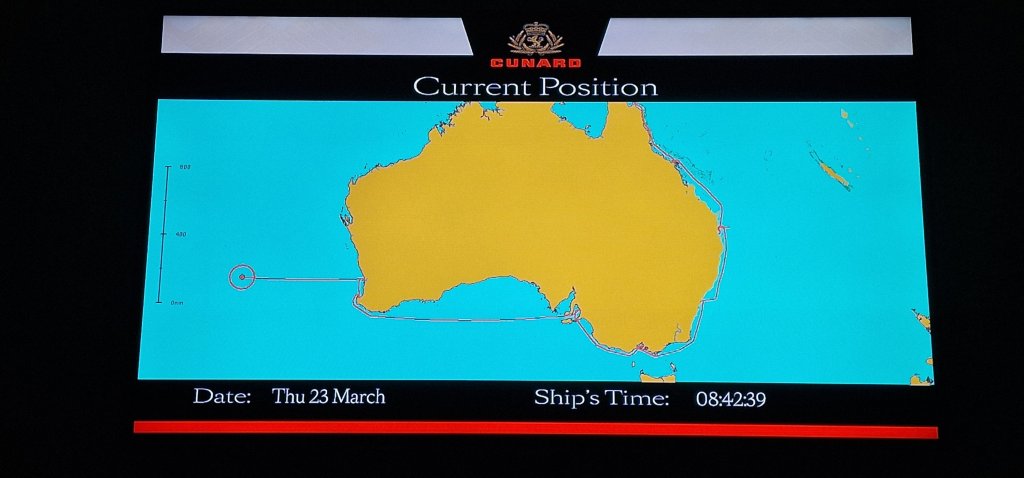 This is Day 2 of seven sea days between Fremantle W.A. and Port Louis, Mauritius. I am not surprised that the air temperature fell below 20°C. There is nothing between where we are right now and Antarctica (except 2050 nautical miles of fresh air and ocean!). That is, according to Captain Hall in his noonday address today. Depth below the keel is a mere 3 kilometres; yesterday, there were 5 kilometres to the seabed.