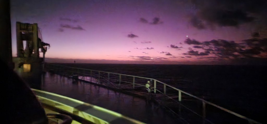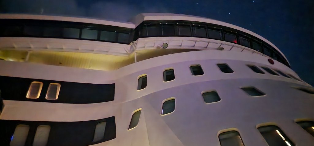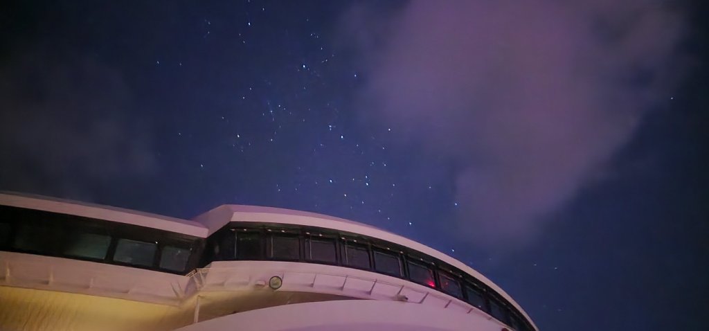 Before dinner, I tried some nocturnal photographs looking up towards the bridge. Sailing west, the sunset is neither side of the ship, and still, I managed a couple of pictures before it went completely dark.