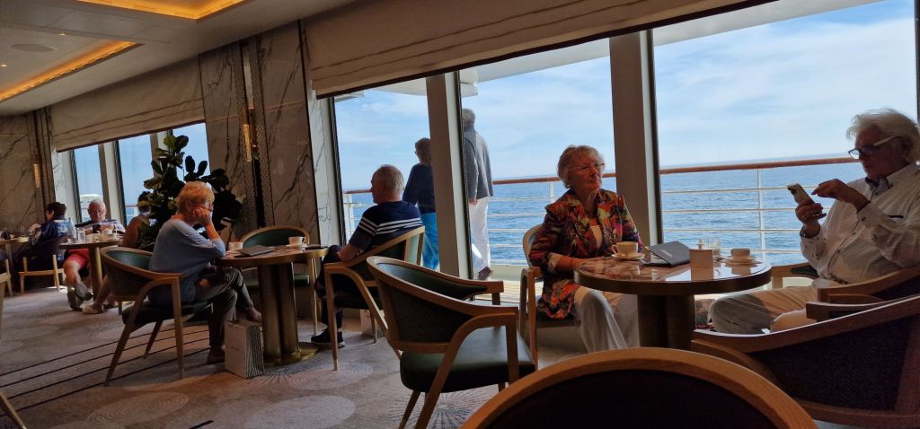 I did contemplate lunch in the Britannia Restaurant, but after some “dithering,” I chose to go to my usual eatery on Deck 9, managing to secure a window seat affording splendid sea views. I was joined by table companion Grace and welcomed the company. However, I have some walking to do. At 15°, outside feels quite cool. Unbelievably, at home 53°N, Buxton basks in the low twenties Centigrade.