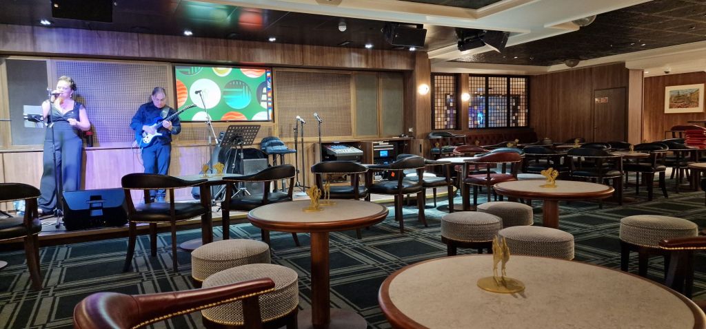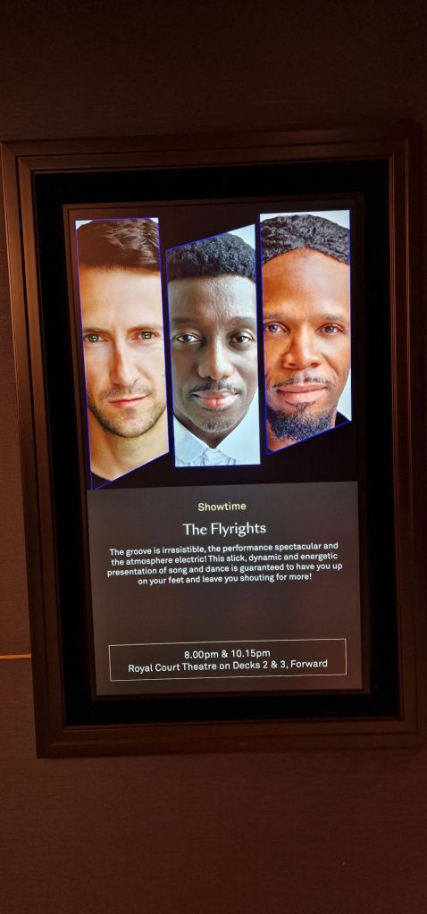 After our final dinner, I joined Malcom and John in the Royal Court Theatre for an unscheduled performance by the Flyrights. Martin had left the dinner table early to wrestle with his packing. To increase my steps total to my minimum target, I took a walk around the central part of the ship before eventually heading to my stateroom.