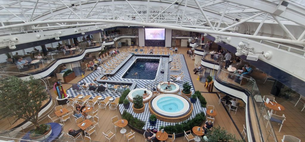 After a fairly efficient dinner, we were able to make the evening show on time. Although I have seen the husband and wife circus, comedy, and juggling act at least once previously, their performance was still mind-boggling. The background graphics were very impressive. After the show,the women filed out together, and I chose to wait around a little before adjourning to the Artisans’ Foodhall for a decaff coffee nightcap. The frequent sound of the ship’s siren, muffled by being inside and other ambient noise, suggested we were again passing through fog or sea mist.