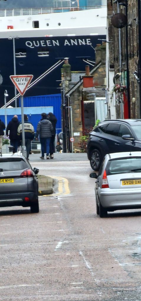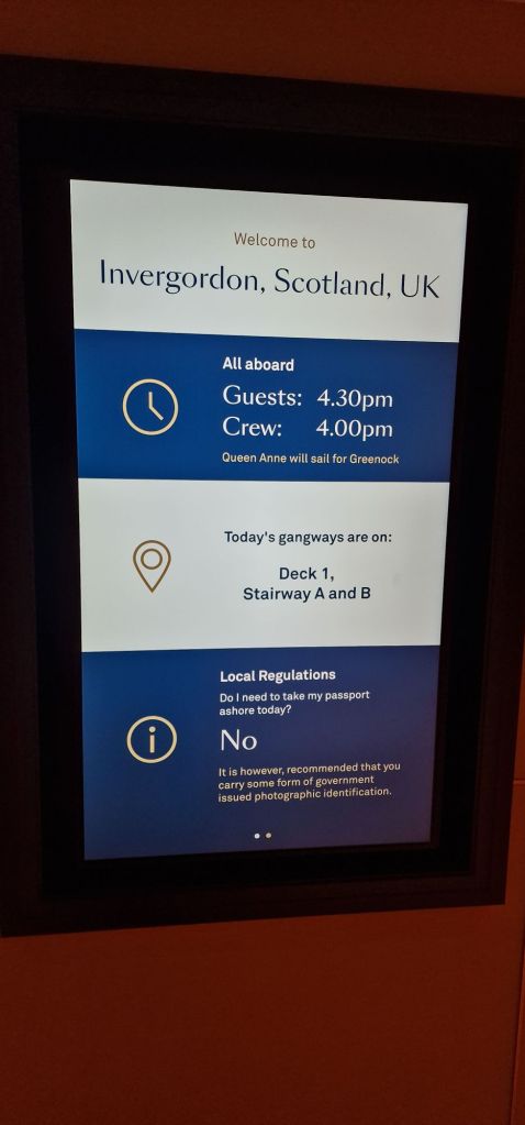 I made my way to reboard Queen Anne and went for a much needed afternoon tea. Now, we are on our way to Greenock. This entails two days of “scenic cruising,” across “the top of Scotland, “which, apart from the naming ceremony in Liverpool, could be the most spectacular part of all three voyages.