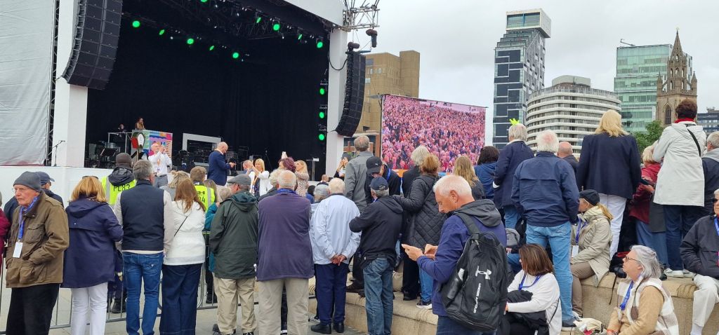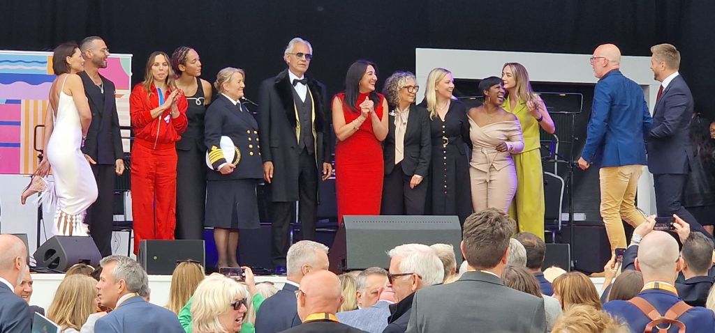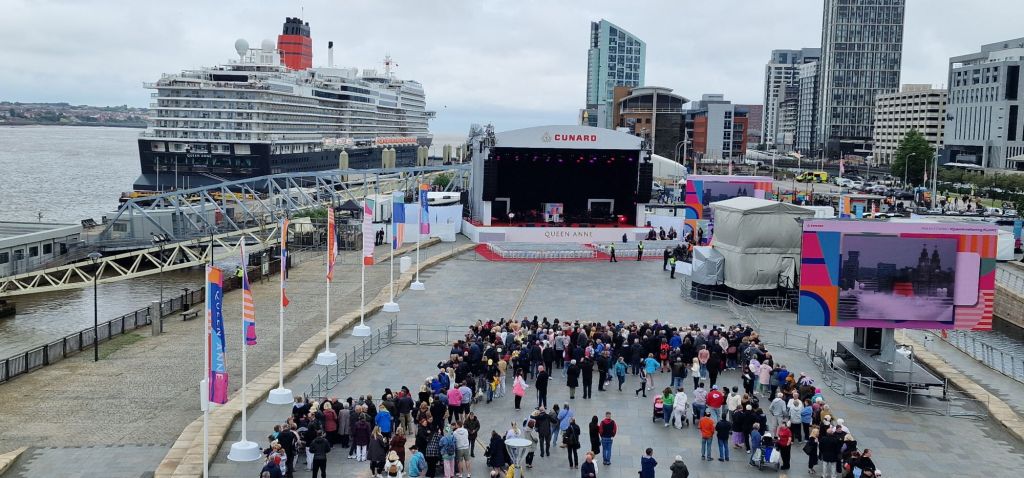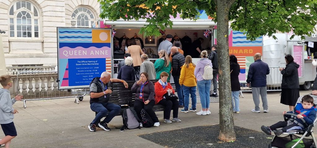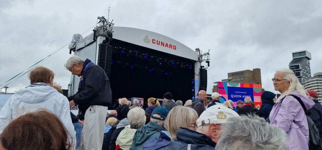 It has been suggested that a member of the Royal Family may have been scheduled to name the ship. However (and I may be misinformed), when a general election is called, Royal Family members have to abstain from public engagements to ensure political impartiality. But nothing was going to spoil my day. I was there, enjoying the celebrations at which no expense was spared. The Cunard branded stage and surrounding flags would have sat well at Glastonbury!
