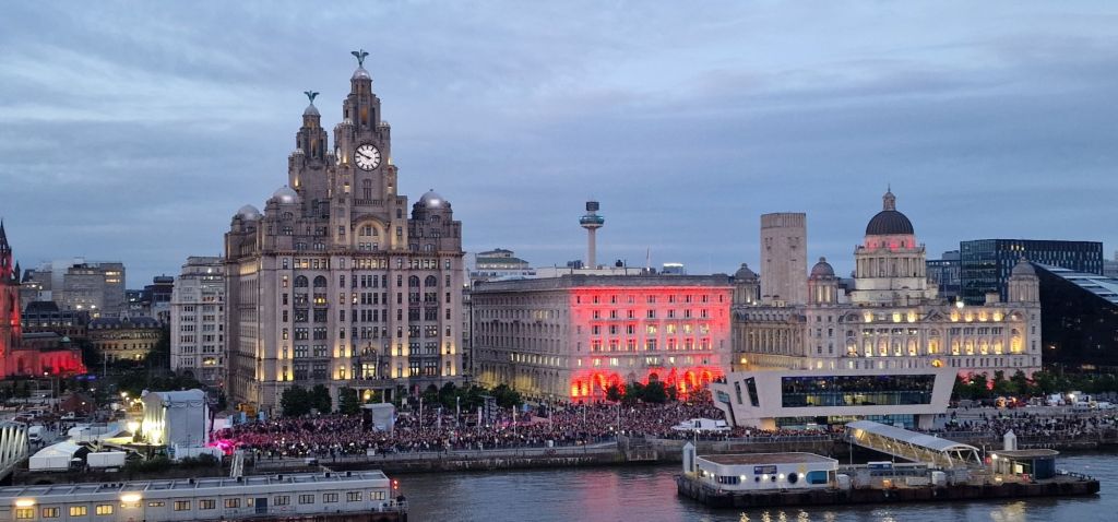 The young commentator enthusiastically did her best with some bits of not quite accurate information. And a live singer entertained with Beatles songs. I would not have missed this for the world. Now, it was time to seek something to eat as I only had my usual breakfast to keep me going. After taking photographs from the upper level of the Mersy Ferry terminal, I found a mobile food outlet offering scouse with fries. This I enjoyed on a waterside public bench. Another such stall was selling pancakes. I was led into delicious temptation with a sugar-free pancake with something that represented lemon juice and genuine sliced banana.