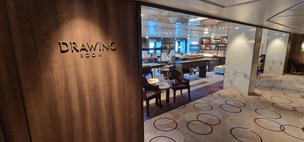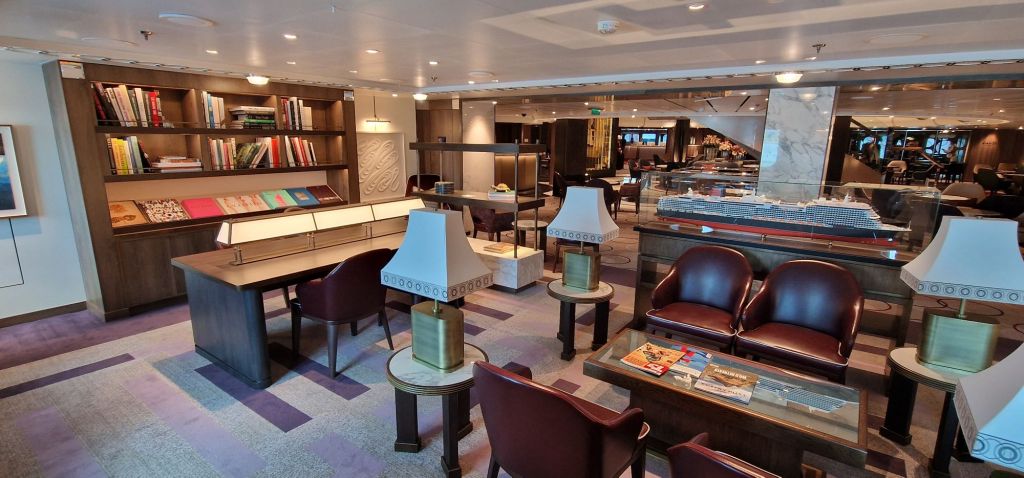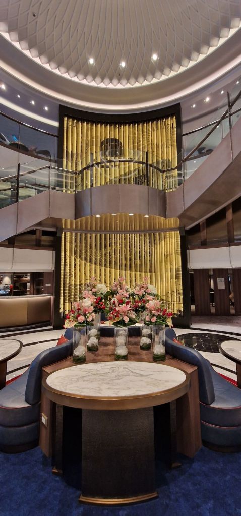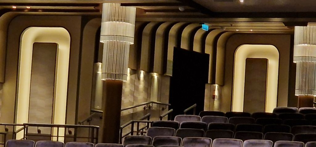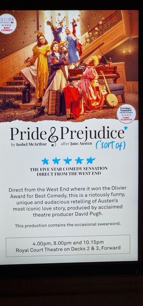 Official model of Queen Anne at entrance to the Drawing Room.Flower display and Grand LobbyThe Bright Lights Society, Deck 2, opposite the Queens Room. Royal Court Theatre, looking towards the back, port-side. Royal Court Theatre art-deco stylingRoyal Court Theatre from the back.Stage set for “Pride and Prejudice – Sort of”, Royal Court Theatre.Cast of Pride and Prejudice (Sort of)