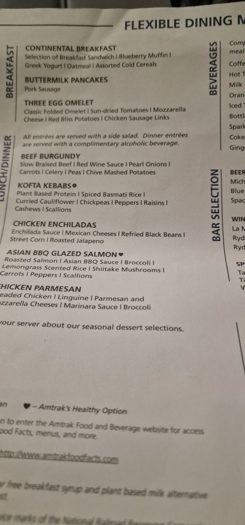 If travelling in a sleeping car, meals throughout the day are included in the fare. I was pleasantly surprised by tonight’s menu.