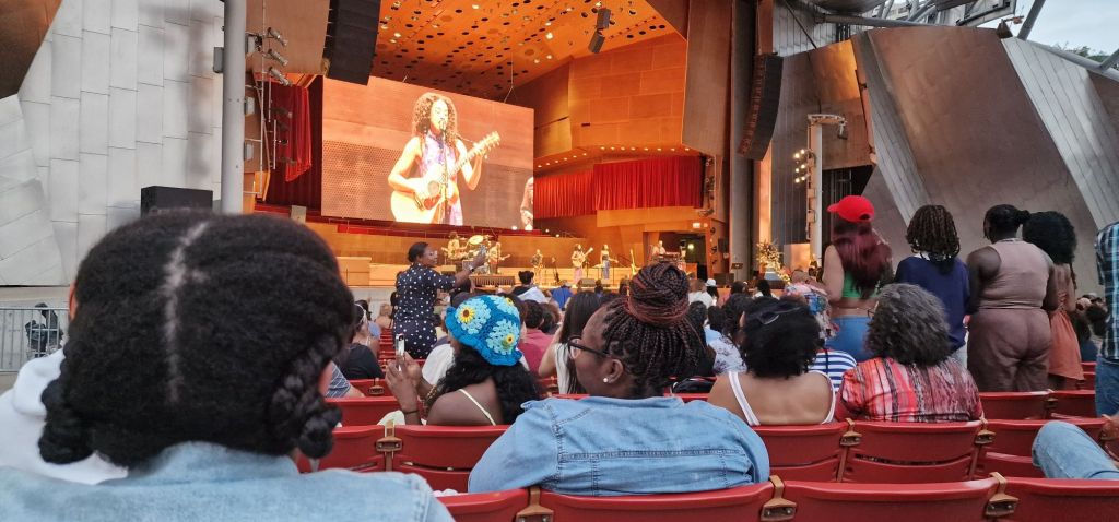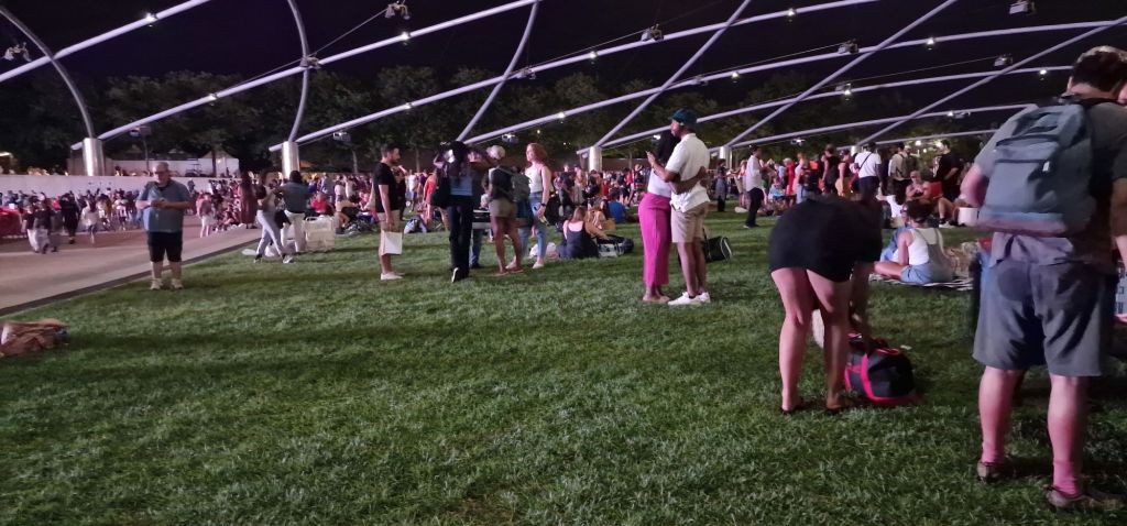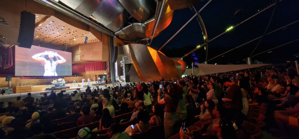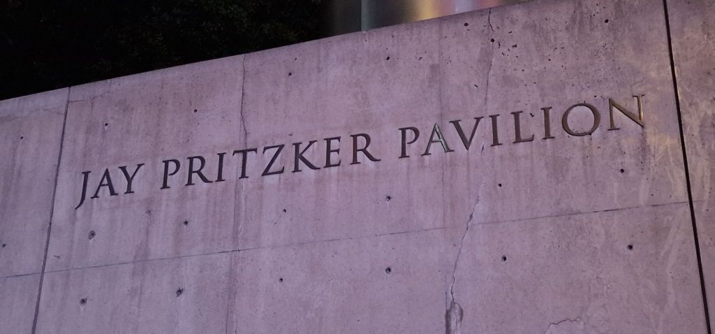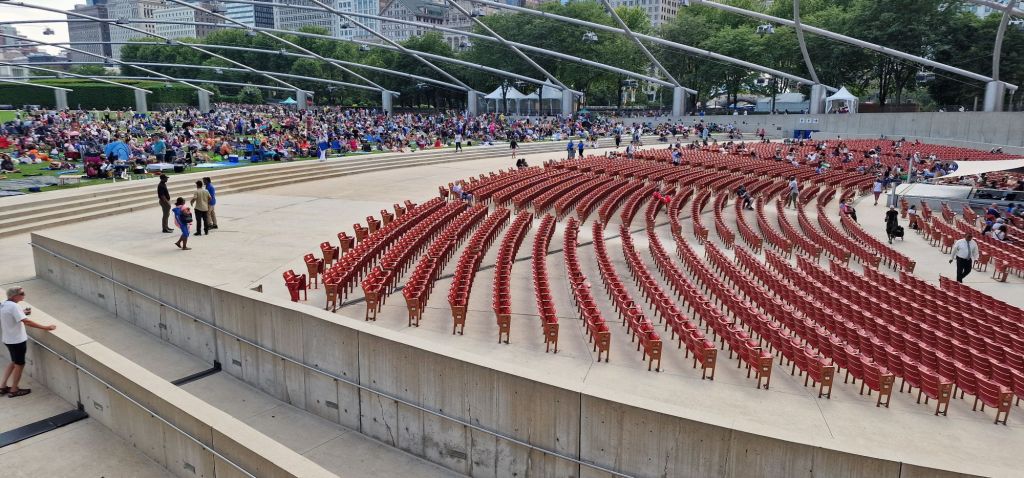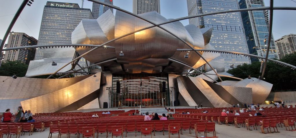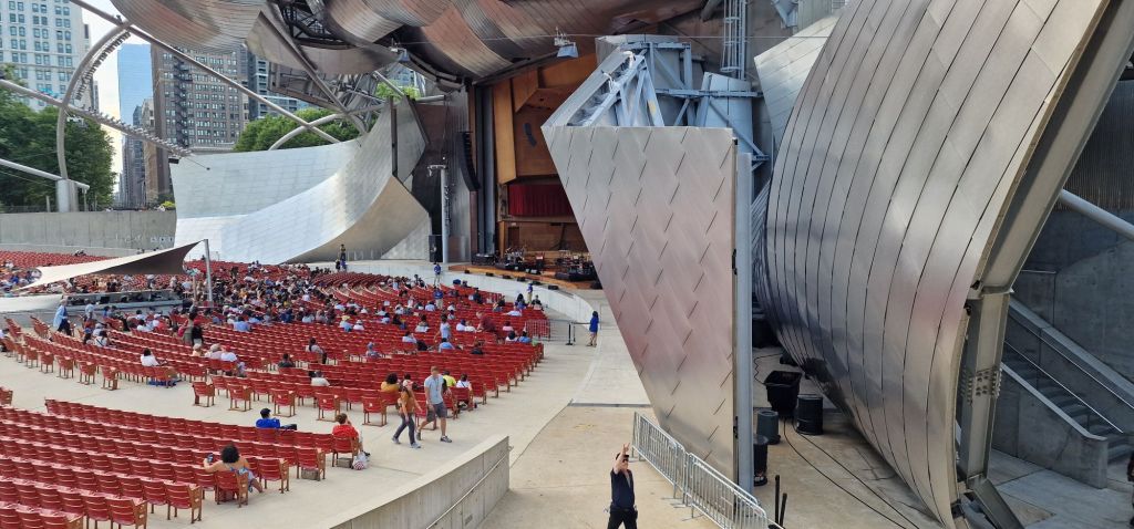 I know absolutely nothing about the genre of music I was enjoying tonight. The venue is known as the Jay Prtizker Pavilion. It was explained to me that Jay Prtizker, whose family had made their fortune with, among other things, Hyatt Hotels, is a philanthropist who built the fabulous Jay Prtizker Pavilion in Millennium Park, which I now understand is a section of the huge Grant Park over which my 19th floor hotel room looks.