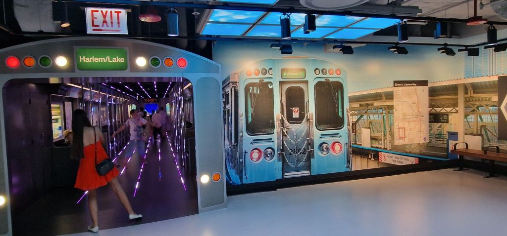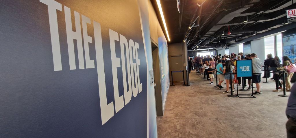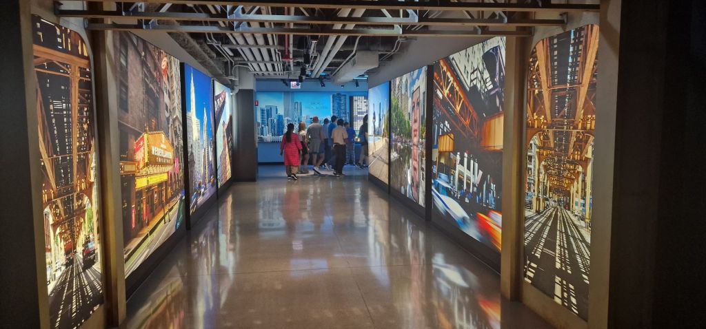 Spectacular graphic illuminated images and models tell the story of Chicago along endless crowd controlled passages. Eventually, one arrives at the lift and not too soon, after endless waiting and moving forward ever so slowly, is “teleported” 100 storeys before being transferred to a second lift to the 103rd floor.