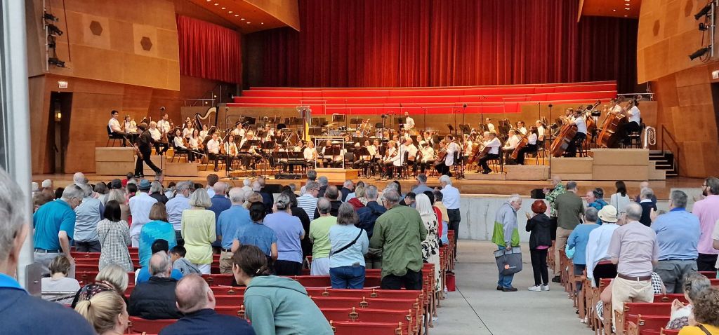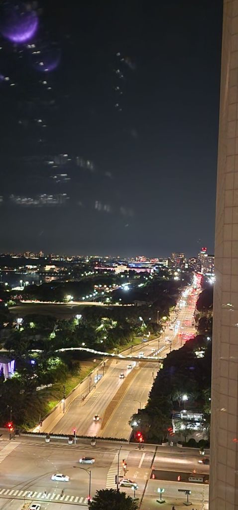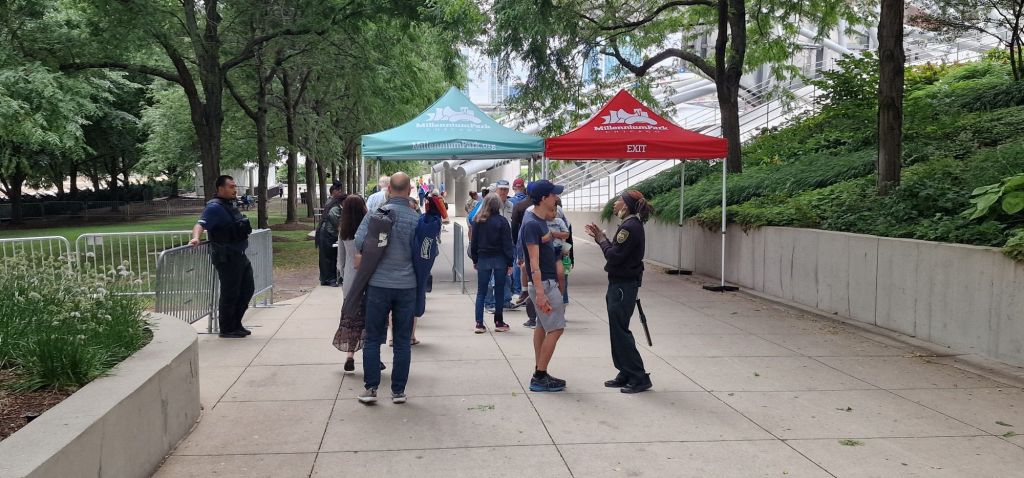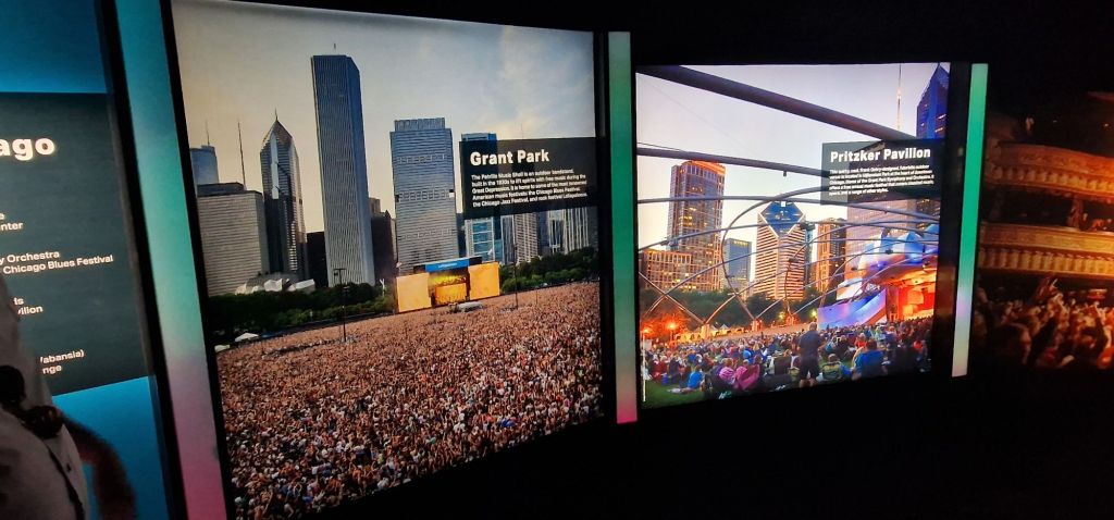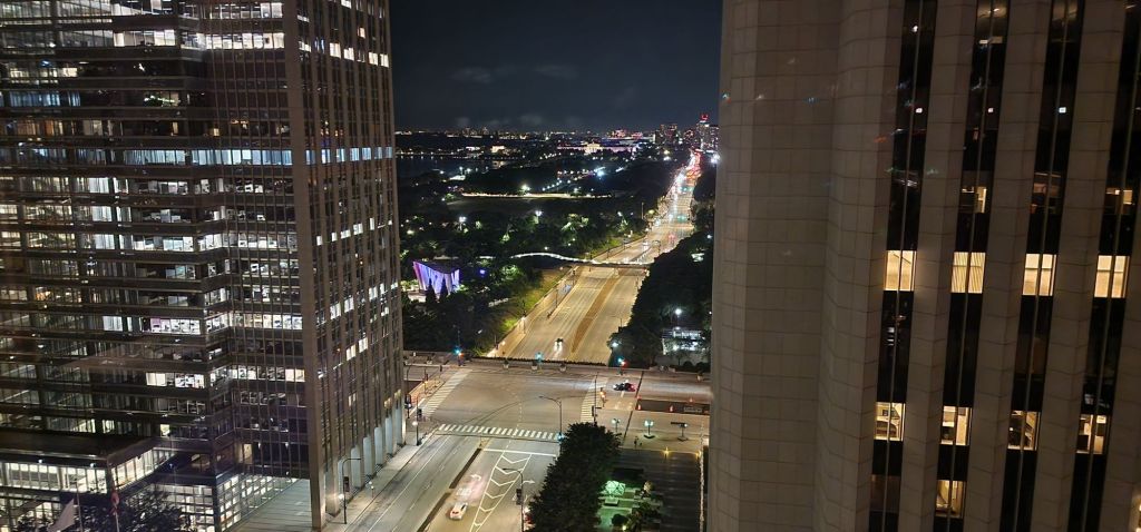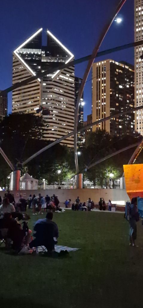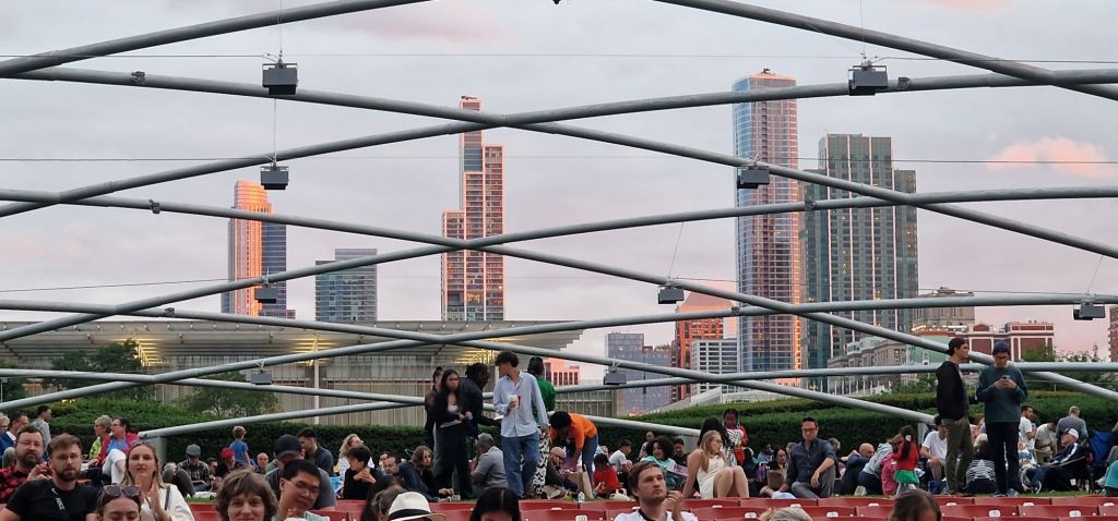The sloping road right by the venue.Approaching security at the Festival Picnickers have already claimed their spot.Standing ovation after the Brahms Double ConcertoSurrounding skyscrapers highlighted by the orange of a setting sun. Tonight’s schedule. I had a long and interesting conversation with one of the concert stewards. (I’m not sure what their official title is.)The concert was not packed in the paying area. Strangely, the more expensive frontseats were much fuller. This is the final season for conductor/director Carlos Kalmar, who retires (or moves on) after 25 years. Next week sees the final week of this classical season of the Grant Park Music Festival. The grand finale – Mahler’s Symphony of a Thousand! Wow!!! I would fly over from the U.K. to be there! But, Mother would disapprove! (10th Sept 08.36 hrs) I am sorely tempted to change my itinerary!After the concert. I would walk back to the Fairmont Millennium Park Hotel where I would, over an unimpressive stodgy turkey club sandwich, try to completethe day’s writing. Nocturnal views from my 19th floor window. Only rooms whose numbers end in 02 or 03, enjoy this spectacular view. I never imagined any of this would happen for a second time, especially so soon after my visit of 2022.