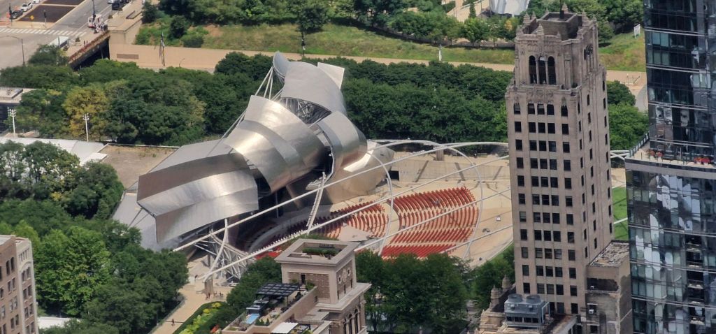 The ChaseTower built 1969. 850ft tall, 60 storeys. 14th tallest building in Chicago, 7,200 people employed there.Aerial view of the Jay Prtizker Pavilion where I wouldpay my third visit tonight for a concert of music by Elena Kats-Chernin, Johannes Brahms, Claude Debussy, and Maurice Ravel.Views looking northwards I assume this is looking west. The Ledges are this side also.