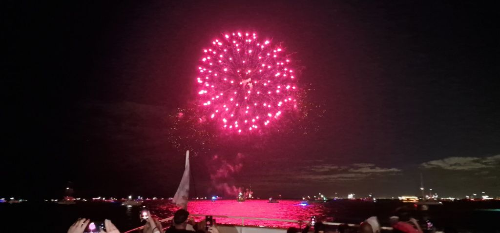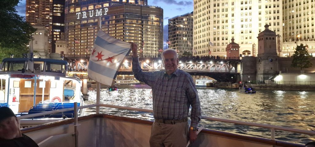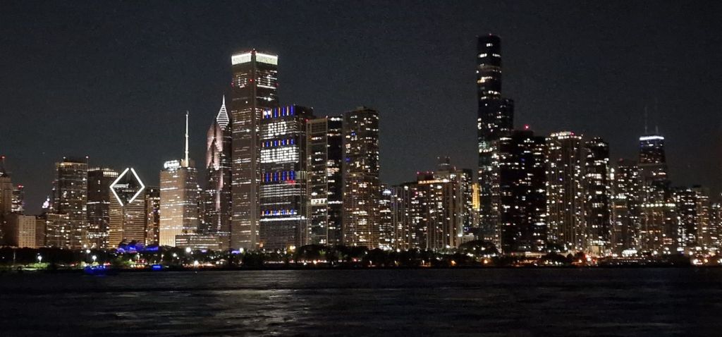 At the end of this afternoon’s river excursion, I signed up for an evening fireworks boat trip, 150 minutes duration. What a brilliant way to spend my last full night in Chicago. The boat sets sail at the weird time of 20.31 hrs. Again, it’s a case of I doubt if I will be coming this way again, although in the almost five days I have been here, I have still hardly scratched the surface of this spectacular city in the middle of a vast continent. The Architects’ Choice is a good river excursion to do more than once. The tour guide is informative, interesting, and sticks passionately to his subject without resorting to feeble entertainment. Tonight, it was very much like this afternoon’s cruise with similar information presented differently by a lady tour guide who has had a book published. I don’t think people were particularly interested in much of the architectural content of tonight’s commentary. However, I did get to see the night-time Chicago lit up like a Christmas tree. There was a warmly convivial atmosphere tonight. And the fireworks display was well worth seeing. I would go again given the chance.