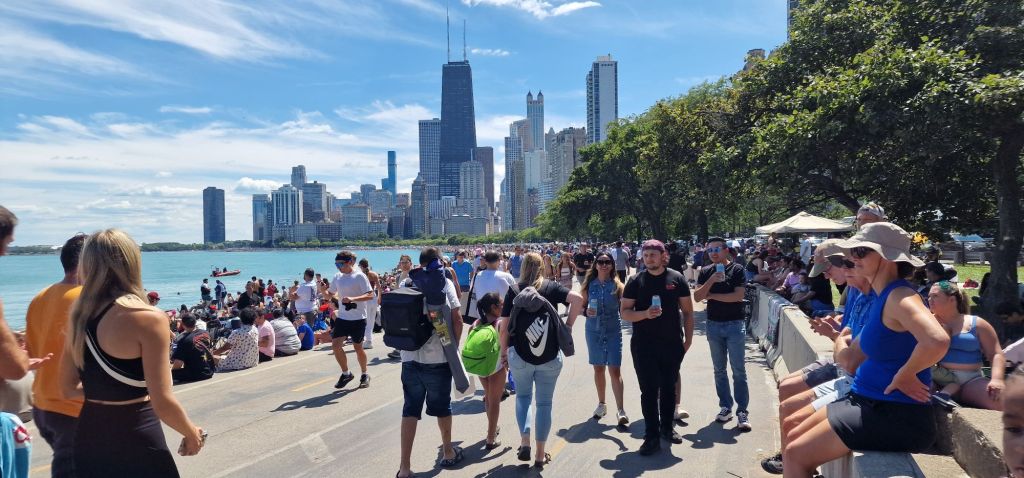 Ye Gods! That was hard work! The hotel concierge assured me it was possible to walk to the Chicago Air and Water Show at I believe, Lincoln Park. I set off along the route I took yesterday to the 360° Tower, continuing eventually walk along Oak Street, which runs along the sandy shores of Lake Michigan, from where the spectacular aeronautical displays can be seen. My challenge was to continue to where the “epicentre” of the show, some 30 minutes from the former John Hancock Tower. Although it was rather warm, I did make it, but it was far too crowded to get a decent view. It never occurred to me how difficult it would be to photograph fighter jets in full flight. While never on my bucket list, I did find the air show a fascinating if exhausting experience, and I do have pictures of sorts to confirm I was there. When back home in the U.K. next month, even I am going to have difficulty believing what I have seen, enjoyed, and experienced.