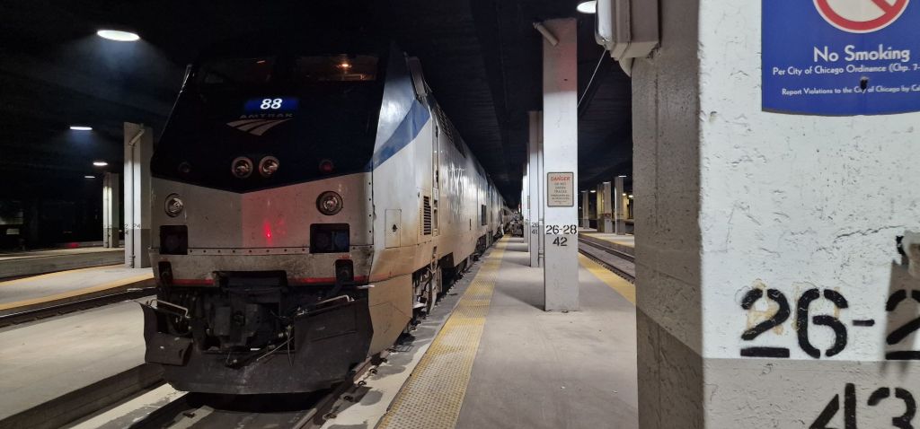 It didn’t matter that I missed my stop; I ended up right next to the “L” overhead railway. While determined to take a ride on one of the trains, I wasn’t confident that I would get back in time for my overnight train to Buffalo. I returned in plenty of time to my (now former) hotel and relaxed close to the temporary eating area. The main restaurant is being refurbished. The doorman hailed me a cab, which took me to Union Station, where I stocked up on food for the journey. I reacquainted myself with the Metropolitan Lounge from where snacks were available, including bananas. We were called to board 45 minutes before departure time this providing a welcome opportunity to photograph the New York bound Lake Shore Limited.