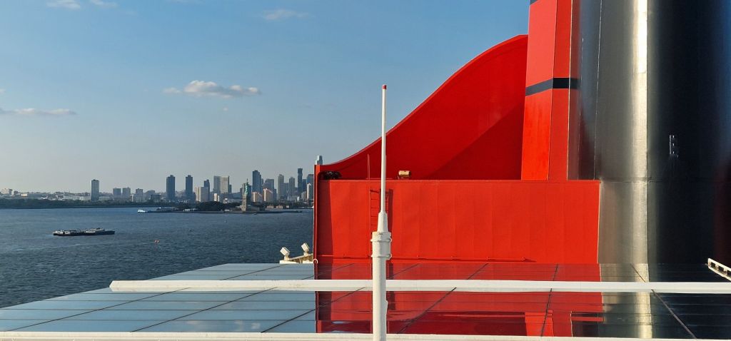 I tell people quite frequently that I don’t like flying. This is partially true. I have little objection to flying during the day west-bound. Returning eastbound from North America overnight – no chance! An eastbound sailing on the world’s only ocean liner at a similar cost is a no-brainer. There is still that sense of occasion arriving by car at the Brooklyn Cruise Terminal in the “salubrious” district of Red Hook. There, Cunard’s 20 year old Queen Mary 2 awaits, longer taller and everything else than any other liner before her. It’s a piping hot day today, and thus, it’s a great shame to be leaving the U.S.A. Despite its recent refurbishment, the harsh north Atlantic has taken its toll on some of the exterior paintwork, and sadly, rust is evident in the hard-to-get-to places.