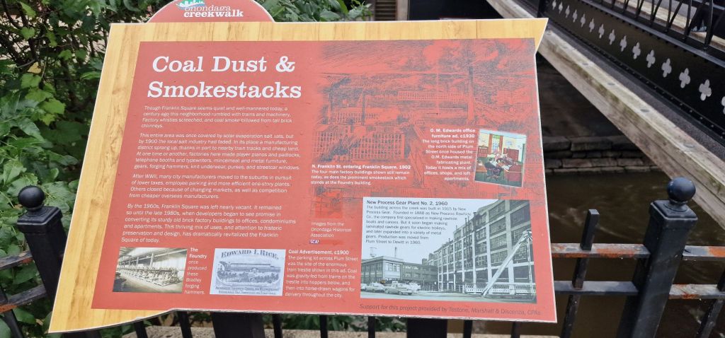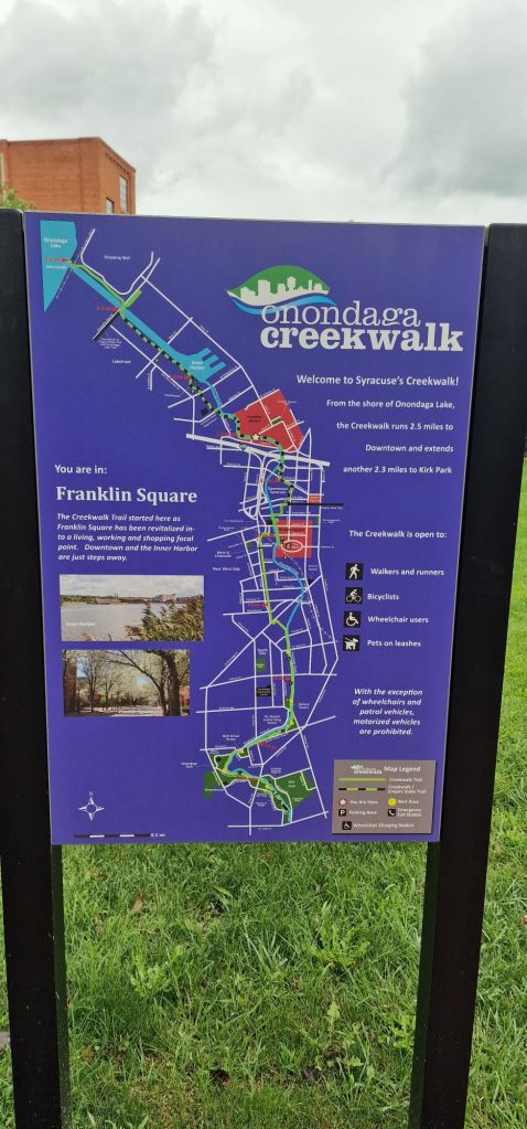 To begin with, I did doubt the wisdom of three nights here. A very heavy and prolonged shower scuppered any exploration of this seemingly dull place during the first morning. Also, the much taken-for-granted temperatures of the mid to high 20s Celsius had given way to something “typical of Buxton in March!” While there was no Metro system to peak my interest, it wasn’t long before I was wishing that I had a few more days here. The Erie Canal Museum, the Museum of Science and Technology, the corporate and commercial architecture of what had been considered might be New York’s state capital instead of Albany. The Onondaga Creek Walk was a recommended hike of just over 2.5 miles each way. Google tells me that the whole route is over 4 miles in length. If I had known, I still doubt whether I could have completed the approximately 9 mile round trip.