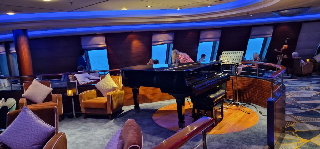 Two decks above the Mareel Spa (and the Library) is the sumptuous of bars at sea, the Commodore Club. Often in the evening, QM2’s very first ship’s pianist Campbell Simpson will tinkle the ivories encouraging the sophisticated hum or sing-along hazy ambience of an expensive city club. The Commodore Club is on all four ships and equally luxurious in their own way.