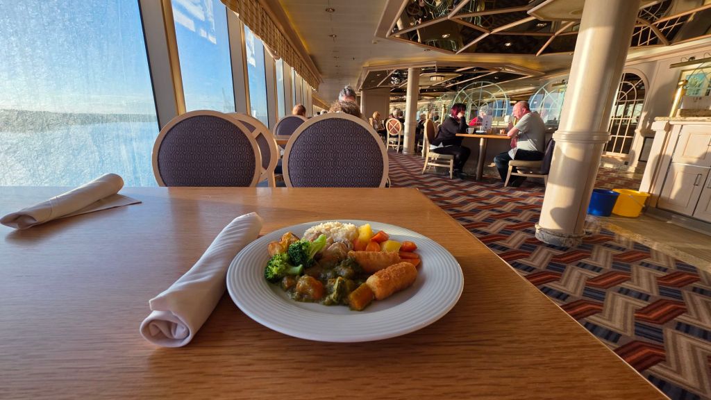I completed my unpacking, except for a few things, and decided to “show up” for the first night in the Britannia Restaurant. My table companions for dinner are all solo travellers, most of whom seem to go from one voyage to another shortly after their previous cruise. Part of me might like to do the same. However, for me, each sea journey is special and it would be a pity for such events to blur into a predictable albeit comfortable routine.