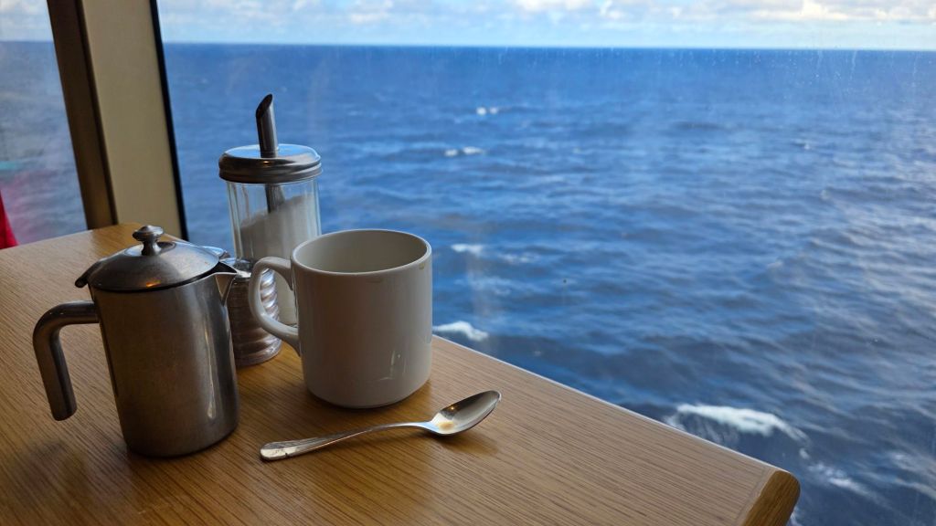 I awoke this morning. the sun shining through my stateroom picture window. I had slept magnificently. Today, Day 6, is the first of six sea days, of promised warmer weather and waves of no more than one and a half metres. This is the Life!