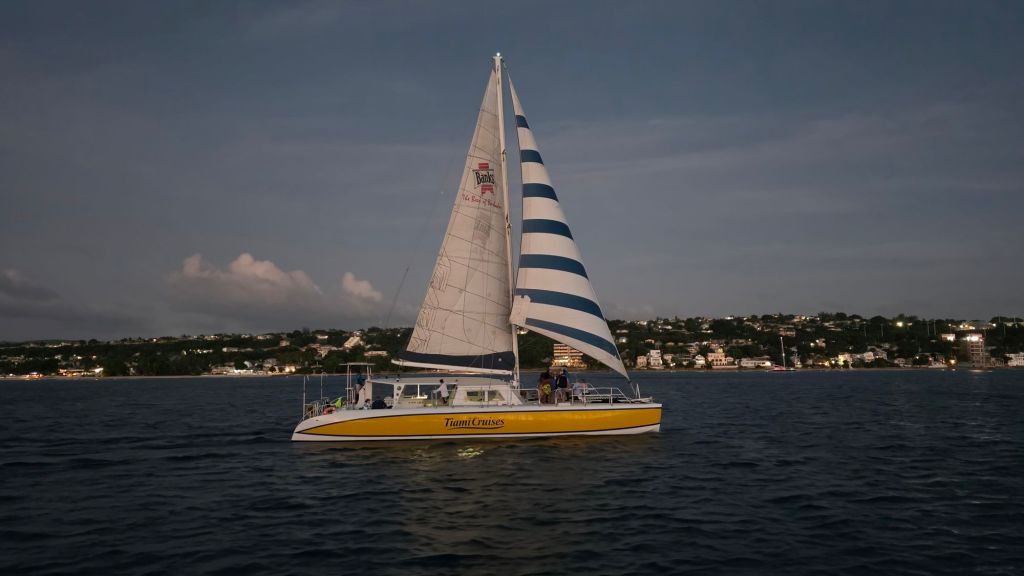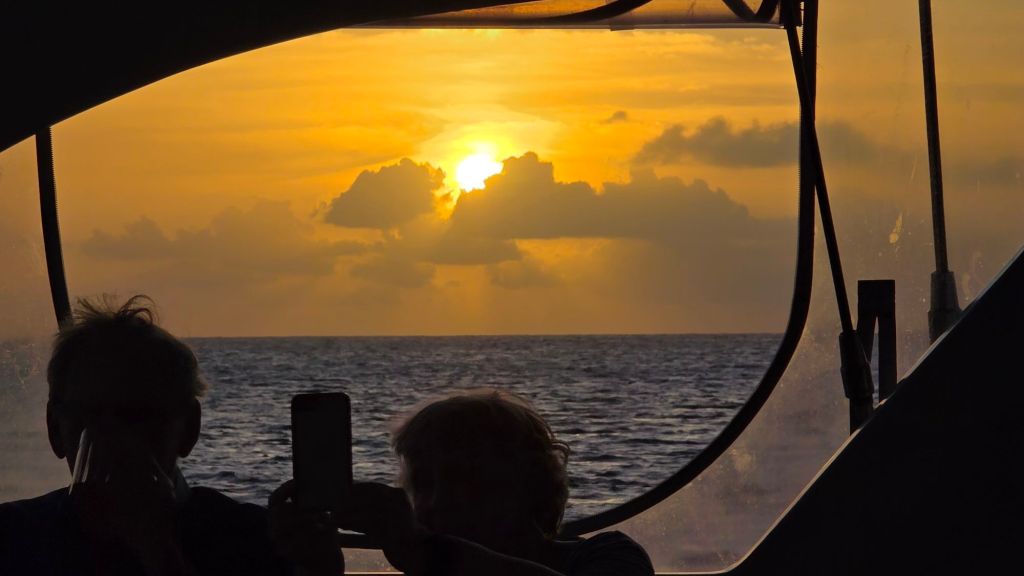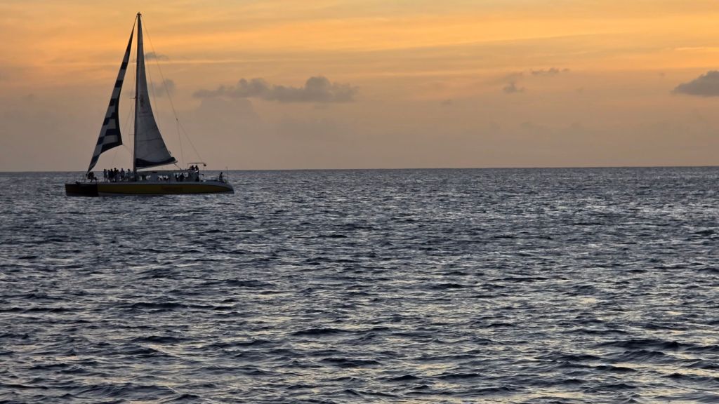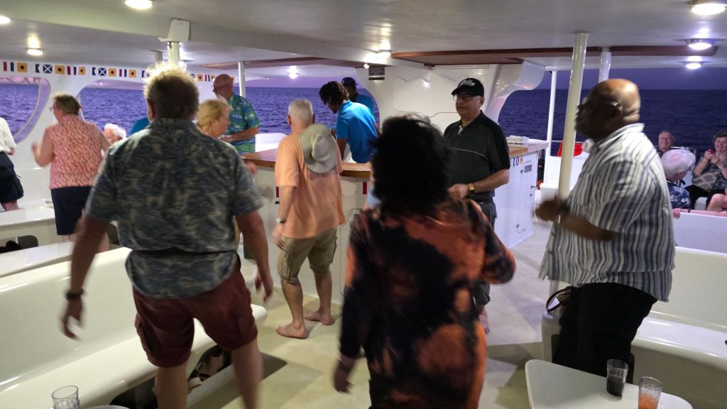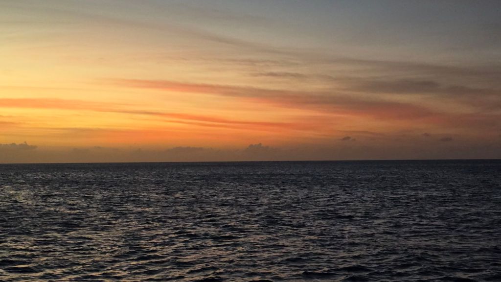 There, I handed in my ticket and boarded a bus which would take us to where we board the catamaran for what was promoted as a Sunset Cruise. This could have been fabulous. But today, Helios was shy and hid behind a convenient cloud, still leaving the darkening sky in surreal shades of pale blue, pink, grey orange and yellow.