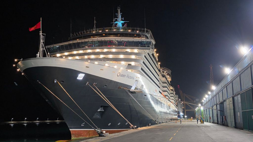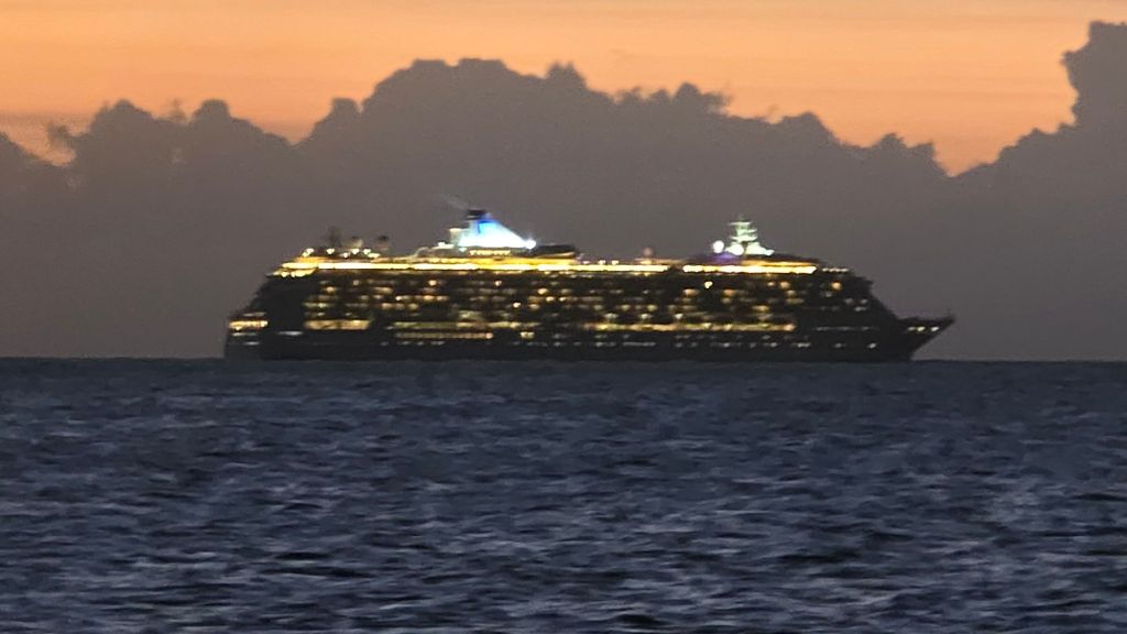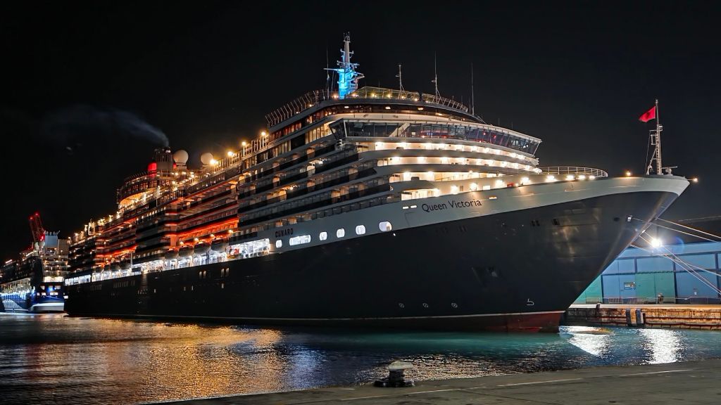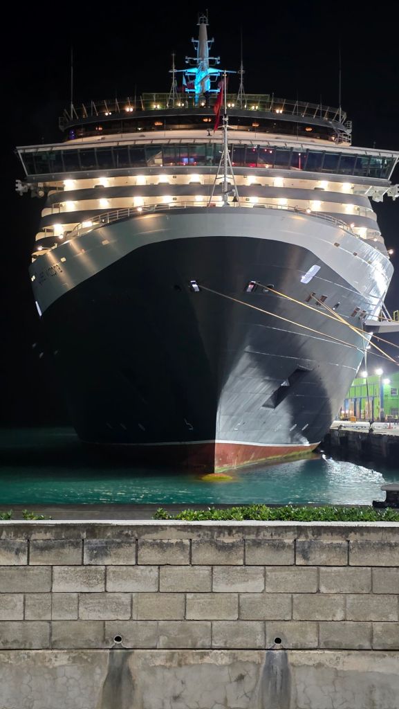Sail away time from Bridgetown was at the unusually late hour of 9 pm giving a rare opportunity for photographing Queen Victoria and Discovery 2 at night.