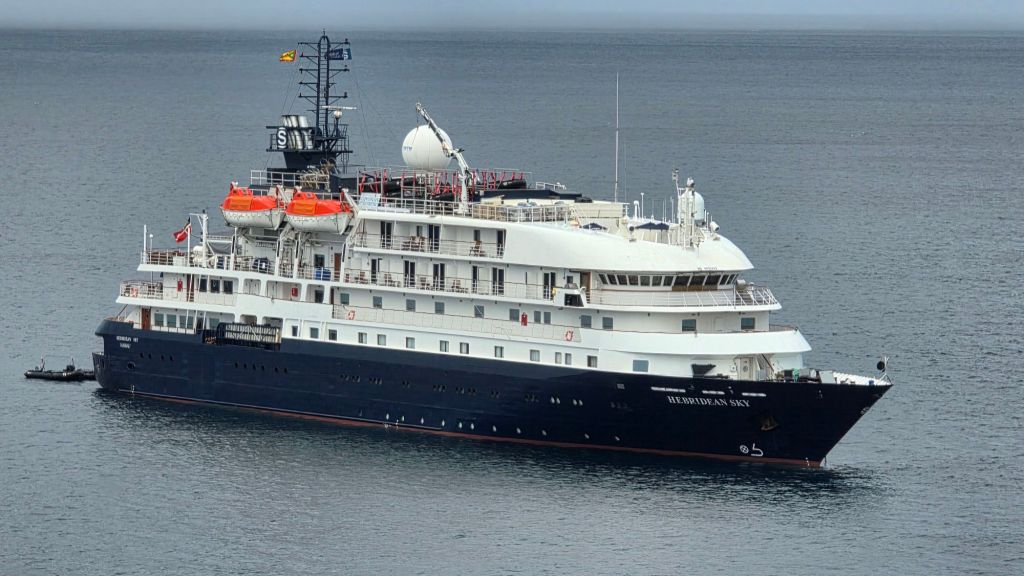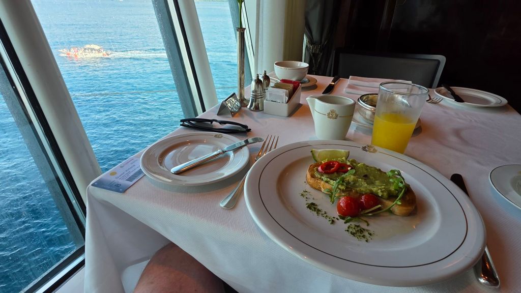 I was up early enough to enjoy breakfast in the main restaurant at a table offering a view of the Hebridean Sky anchored behind M.S C.’s Magnifica alongside Queen Victoria.
