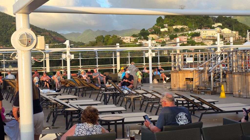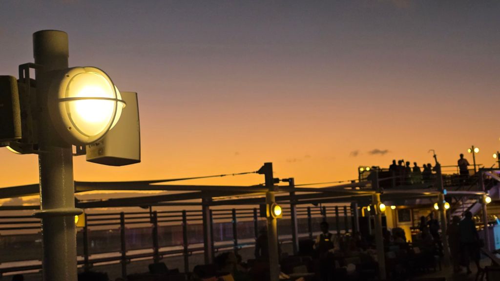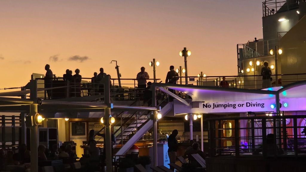 A small two piece band played aft on Deck 9 and numerous souls milled around silhouetted against a setting sun