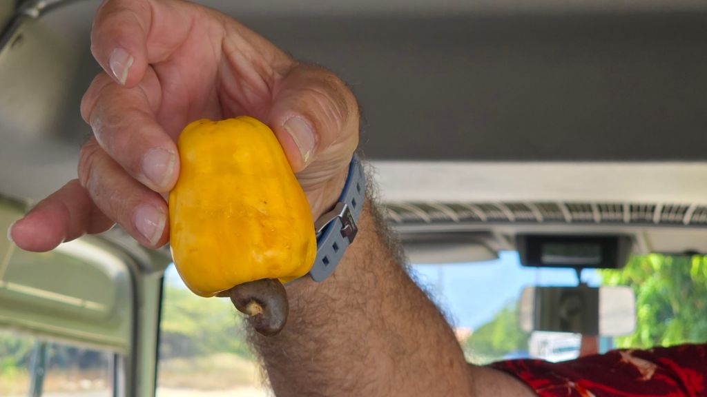 It was a good trip. We first stopped by a tree yielding cashew nuts. We received a little talk on the benefits of cashew juice. especially reducing the prostate size. Wow! Except I so far see no reference to this on Google. It’s good for the heart ‘though.