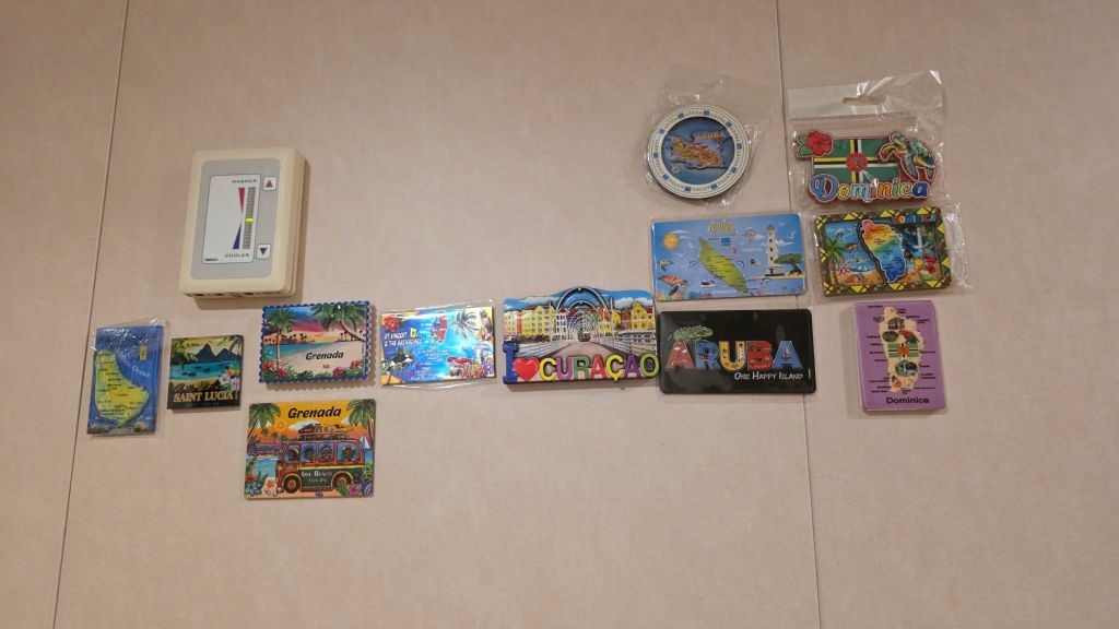 Each column from left to right represents a port visited in order of when called at. There may only be one fridge magnet in the column. I did something similar on the first three voyages of Queen Anne back in 2024. On this voyage, we call at 10 Caribbean ports. Visited already are Bridgetown Barbados, Castries St. Lucia, St. George’s Grenada, Kingstown St. Vincent and the Grenadines, Willemstad Curacao, Oranjestad Aruba, and Roseau Dominica. All apart from St. Lucia were places I had visited previously, never really expecting to come back. (07.17 hrs)