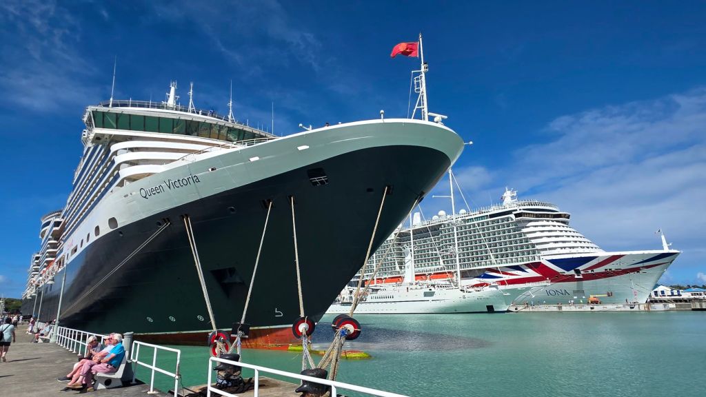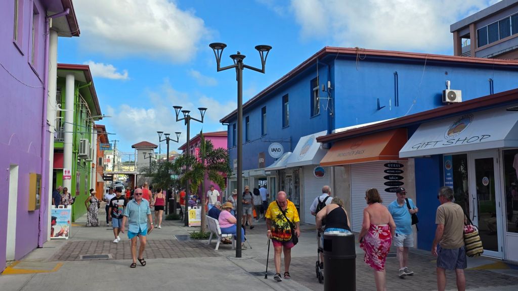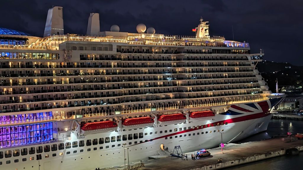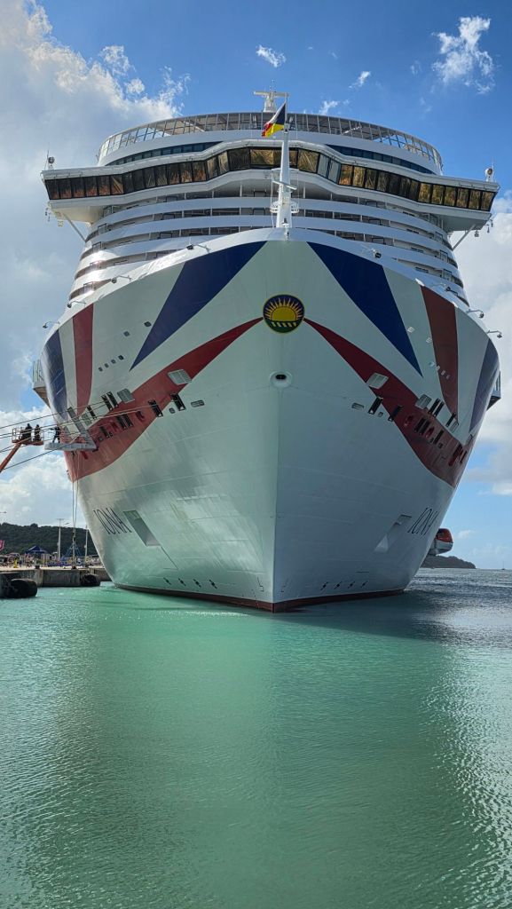 All too soon, it was time for the bumpy ride back to the ship, stopping briefly at the Sir Vivian Richards Cricket Stadium established in 2007. On arrival back at the ship, we said our goodbyes for the time being, catching up very soon over dinner. We went our own ways. My hope was to get something to eat and catch up in writing this blog at a quiet table. No chance!. All the eateries I came across were full. 22.32 hrs. The up side was seeing so many passenger ships together. If every bed, including the fold-down beds is some cabins were occupied, the two P&O ships could have flooded St. John’s with c12,500 passengers. I doubt that either massive ship was full to that kind of capacity. Nevertheless, I would say that between the five ships in port, a good c13 500 visited St. John’s that day, boosting its economy like a lottery win.